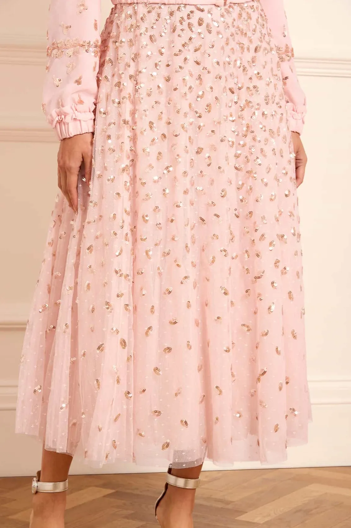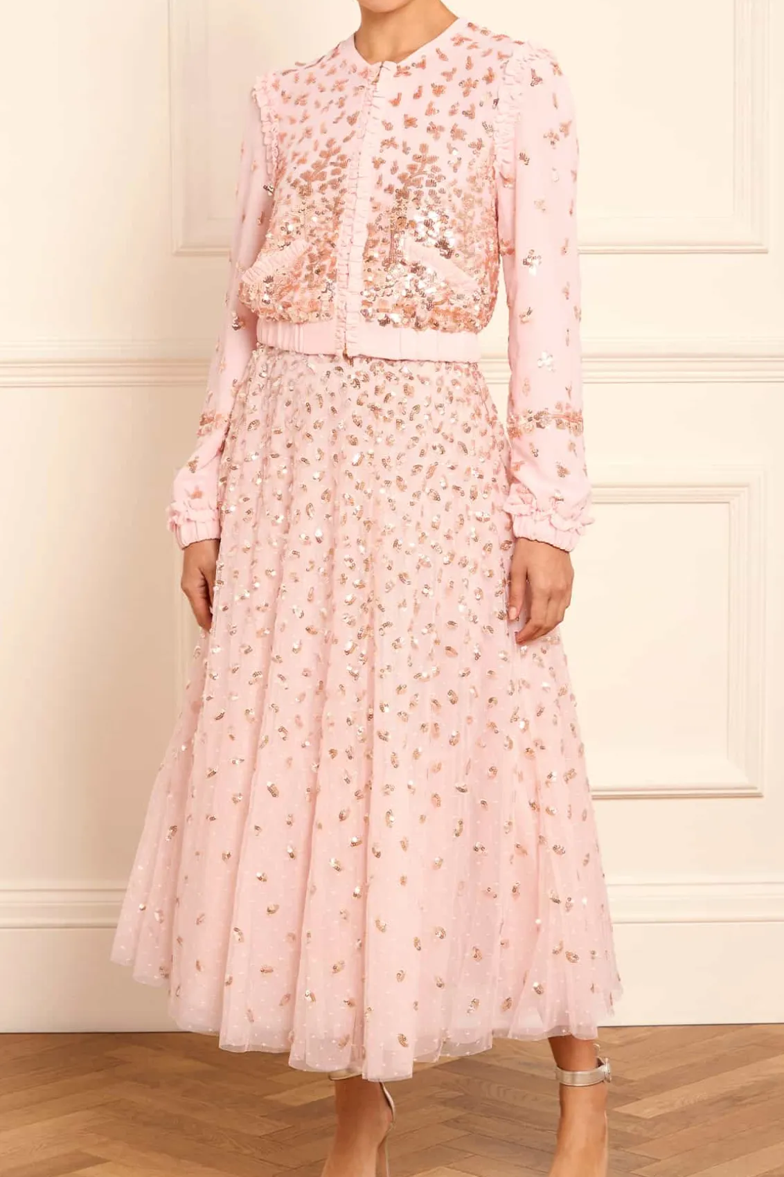 The Autumn Leaves Ballerina Skirt in Dusk Pink / Caramel. Our signature tulle skirt with a refresh for the season ahead. Needle & Thread are introducing decorated skirts into our new Autumn/Winter collection. This layered tulle skirt is developed with a generous hem sweep for movement. Beautifully designed with glistening leaf motifs scattered towards the hem to be reminiscent of falling autumn leaves. We recommend styling it with our bomber jacket for maximum impact.