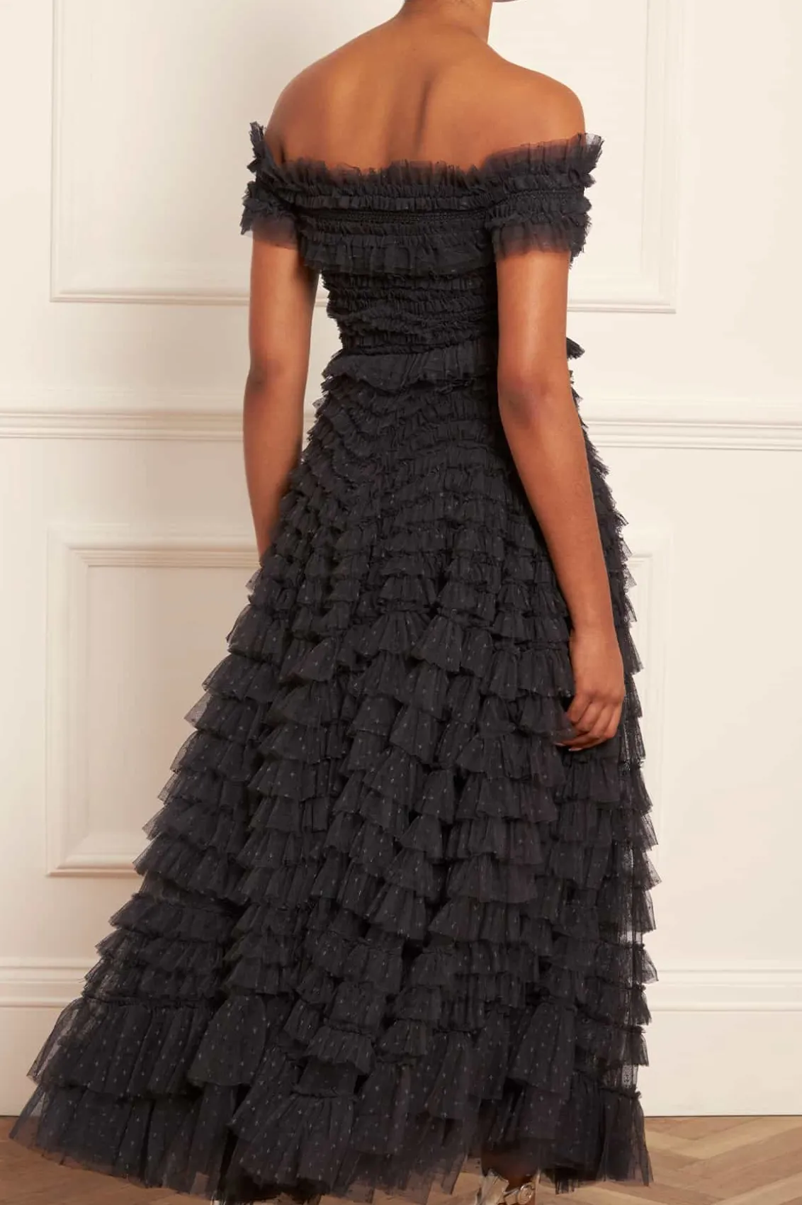 The Hattie Ruffle Skirt in Graphite. This textile skirt is engineered with layers of soft tulle and net to create a signature Needle & Thread style. Crafted with individual ruffles to create a beautiful, frilly texture. Designed with a sweeping hemline and finished at the waist with a satin ribbon for extra detail. We recommend pairing this skirt with our knitwear for a romantic Needle & Thread look.