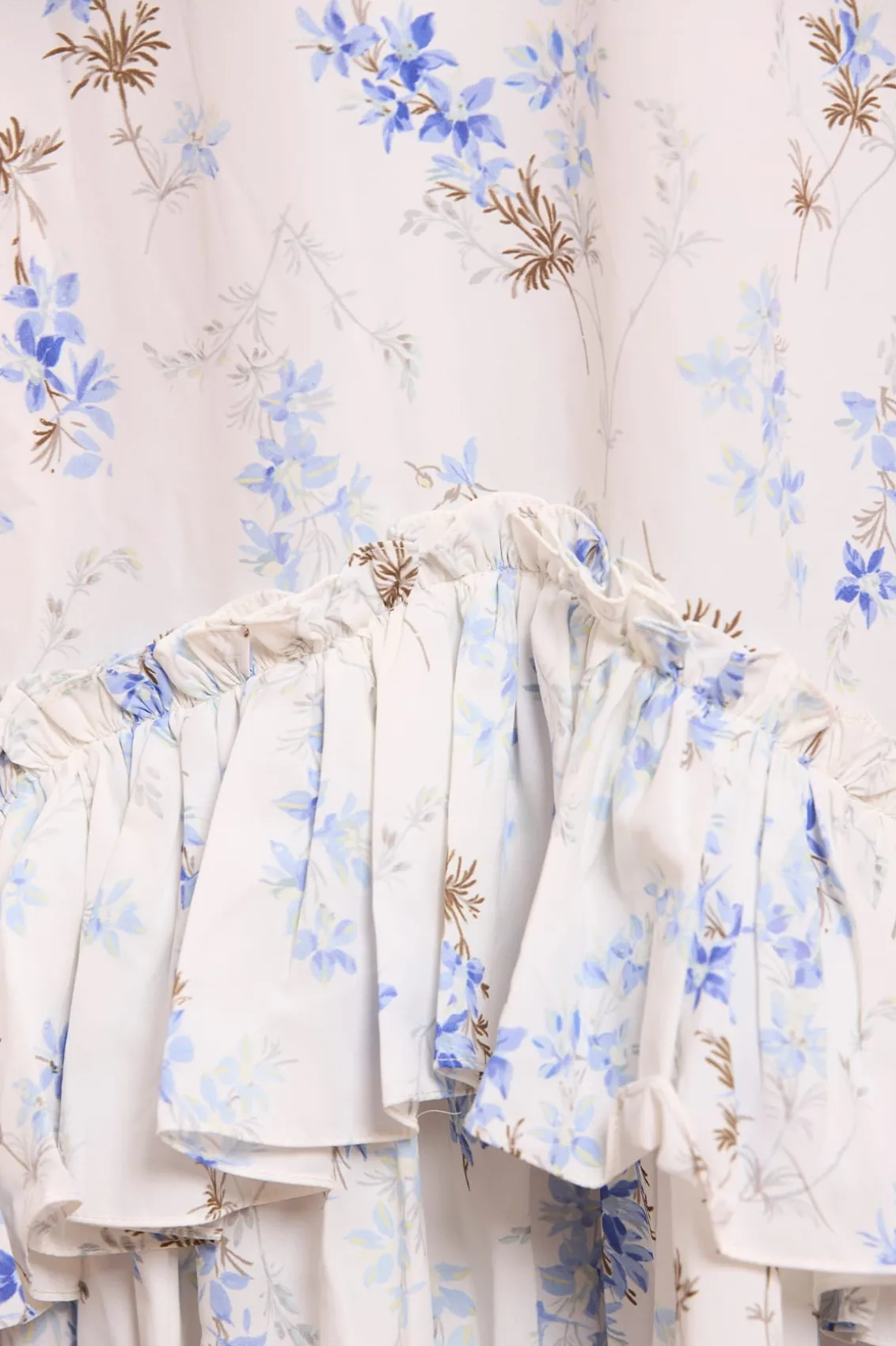 NEW SEASON. The Ophelia Ditsy Eva Crepe Ballerina Dress in Moonshine/Blue. This dress features a beautiful, romantic trailing print taken from an archive, hand-painted artwork from the early 1900s, depicting soft, whimsical ditsy floating florals. Inspired by 1930s tea dresses, it is adorned with elegant frills and offers an effortless, flattering fit with a V-shaped waist seam. The romantic fluted sleeves are detailed with frills, making this dress perfect for any occasion. The perfect piece to take you from day to night.