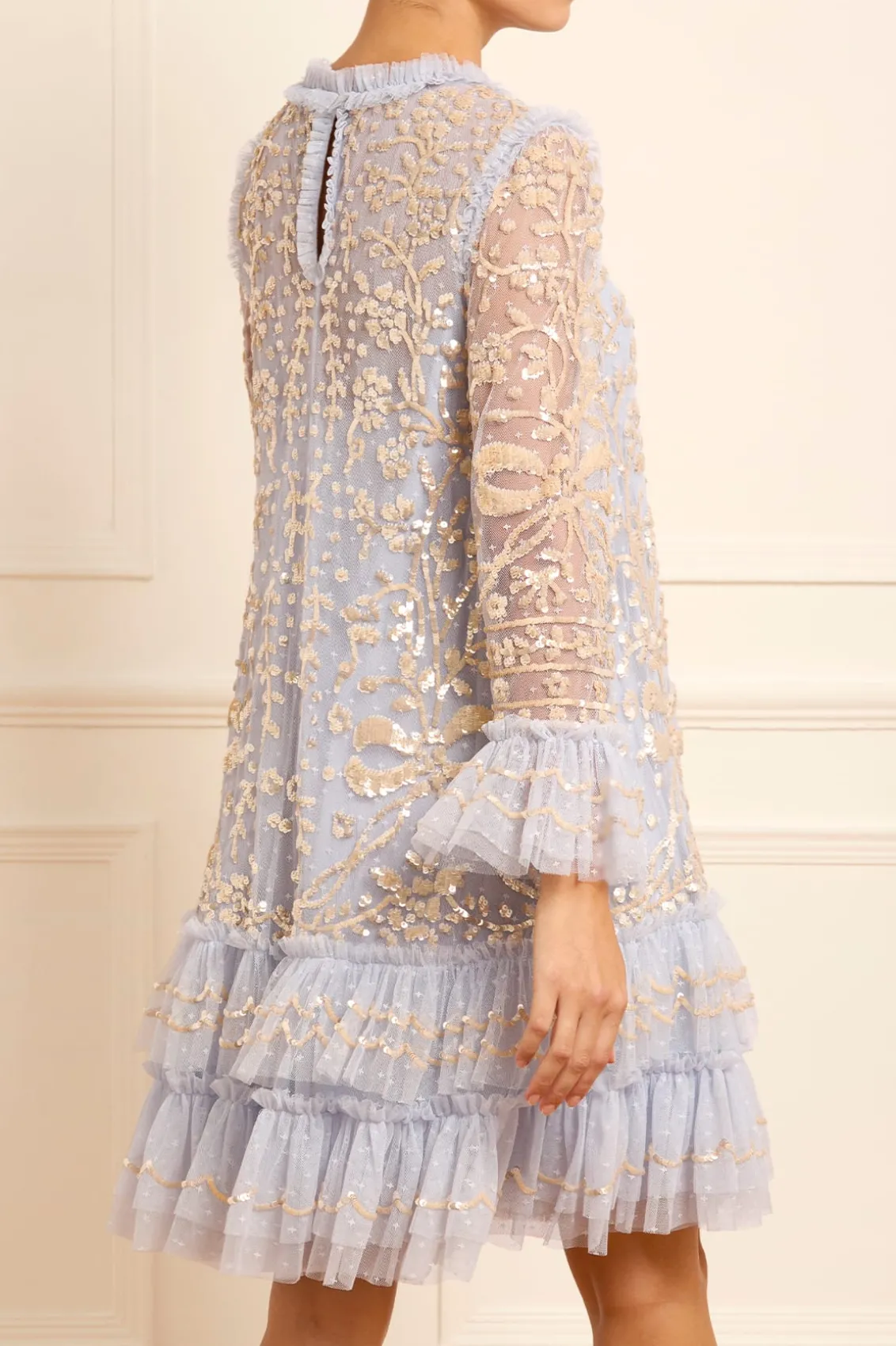 NEW SEASON. The Celia Long Sleeve Mini Dress in Dusk Blue/Gold. This statement dress is designed with romantic artwork featuring ornate florals and ribbon bows, densely embellished with shimmering sequins for exquisite detailing. Crafted with an effortless loose fit with soft, playful tulle frills on the hem and cuffs. A key piece in our collection.