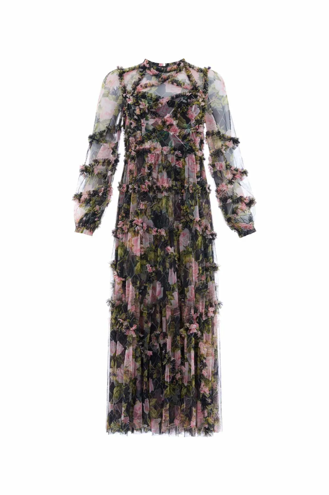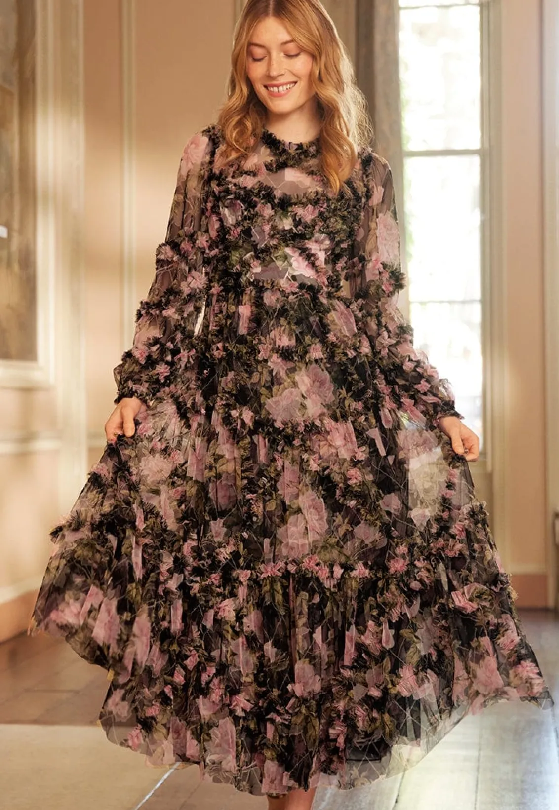 The English Rose Diamond Ruffle Ballerina Dress in Graphite. This ballerina dress is inspired by a traditional rose print taken from a 1900s hand-painted artwork, in soft hues of deep pinks. Developed with signature Needle & Thread styling featuring perfectly engineered frills for all-over delicate texture. The perfect dress to take you from dinner to the dancefloor.