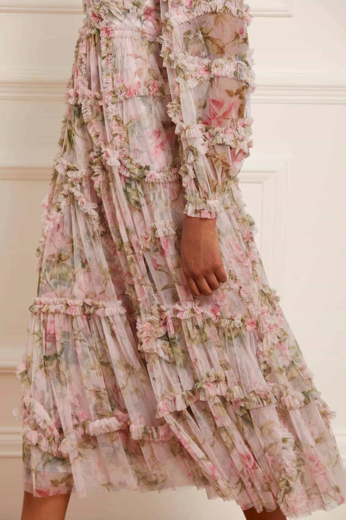 The English Rose Diamond Ruffle Ballerina Dress in Sky Pink. This ballerina dress is inspired by a traditional rose print taken from a 1900s hand-painted artwork, in soft hues of deep pinks. Developed with signature Needle & Thread styling featuring perfectly engineered frills for all-over delicate texture. The perfect dress to take you from dinner to the dancefloor.