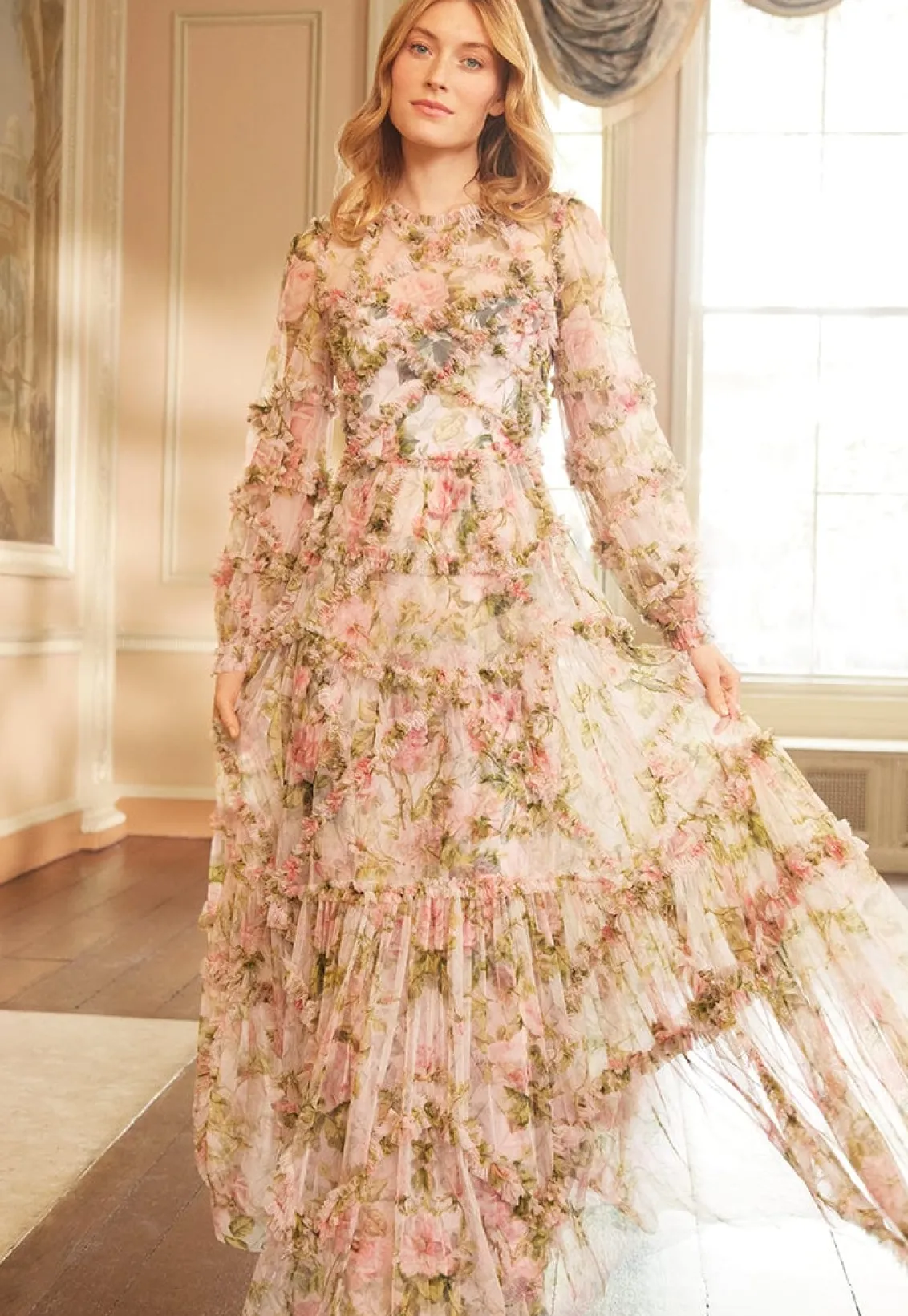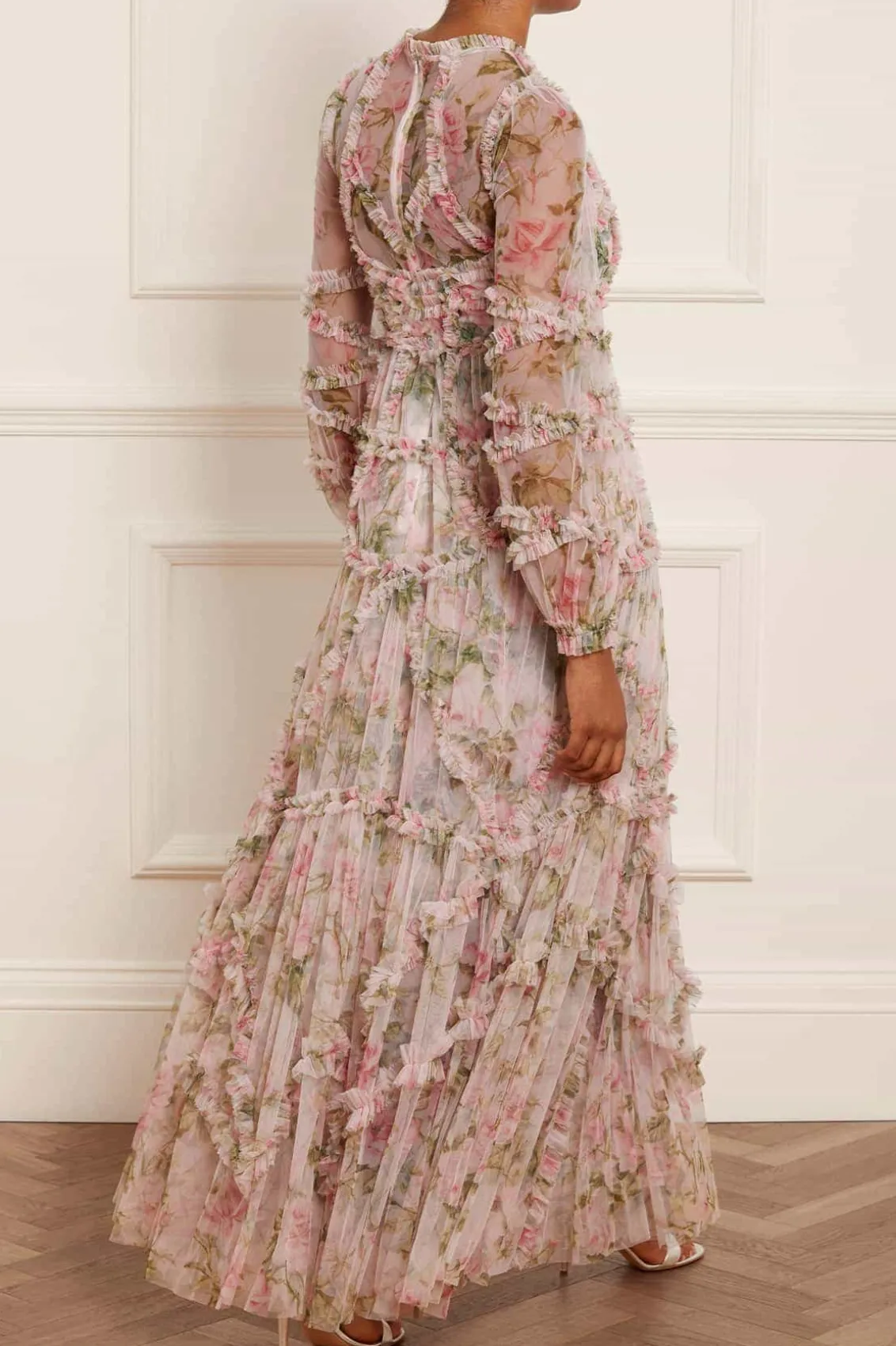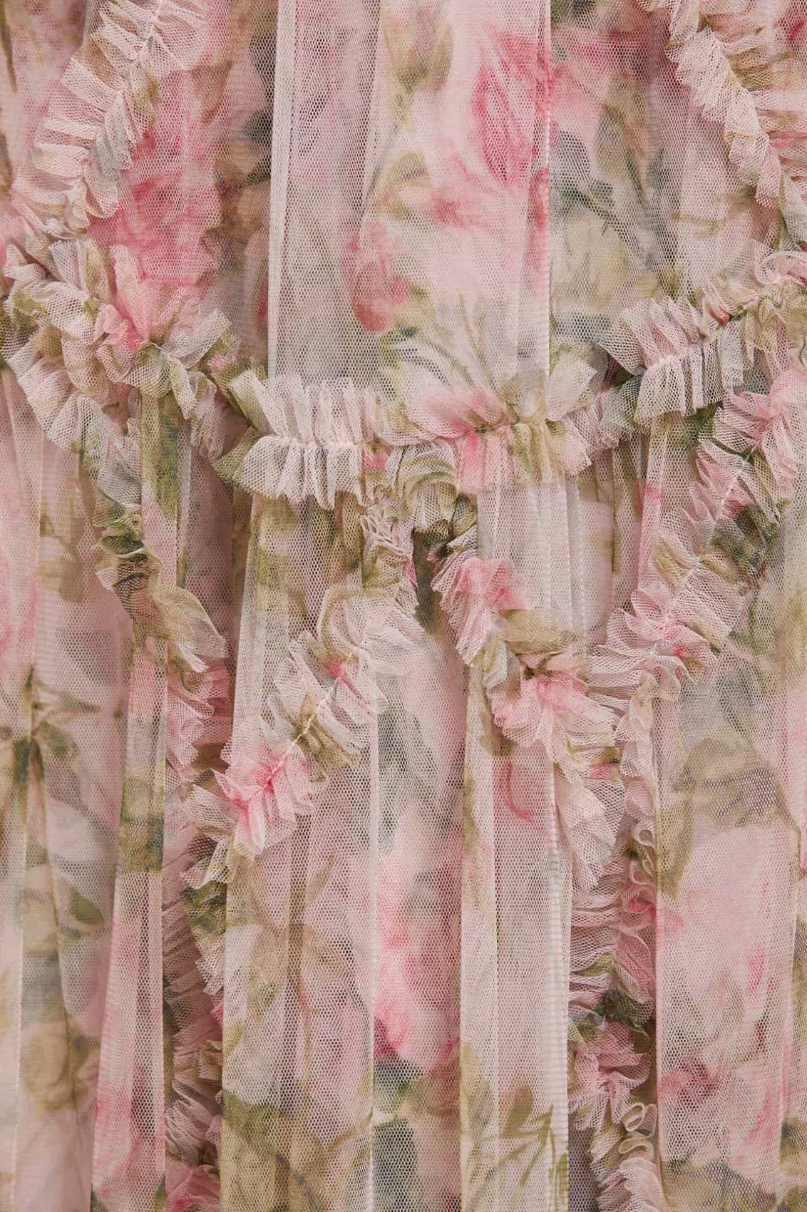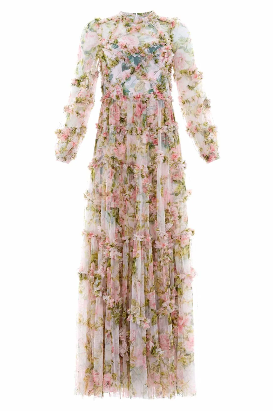 The English Rose Diamond Ruffle Gown in Sky Pink. This gown is inspired by a traditional rose print taken from a 1900s hand-painted artwork, in soft hues of deep pinks. Developed with signature Needle & Thread styling featuring perfectly engineered frills for all-over delicate texture. The perfect gown to take you from dinner to the dancefloor.