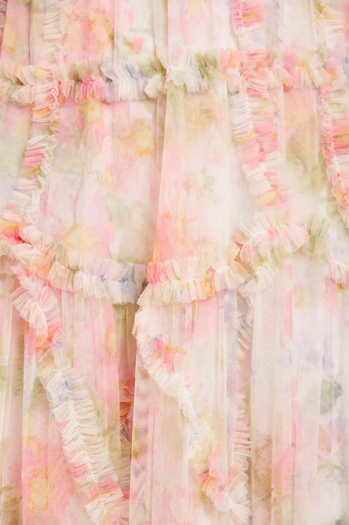 The Immortal Rose Maeve Long Sleeve Ballerina Dress in Moonshine. This beautiful dress features a romantic print captured from an antique, hand-painted artwork from the early 1900s. Decorated with wild rose motifs in soft pink shades intertwined with green foliage. Developed with our signature Needle & Thread textile tulle and gathered frills perfectly engineered around the body. The perfect dress for an upcoming special occasion.