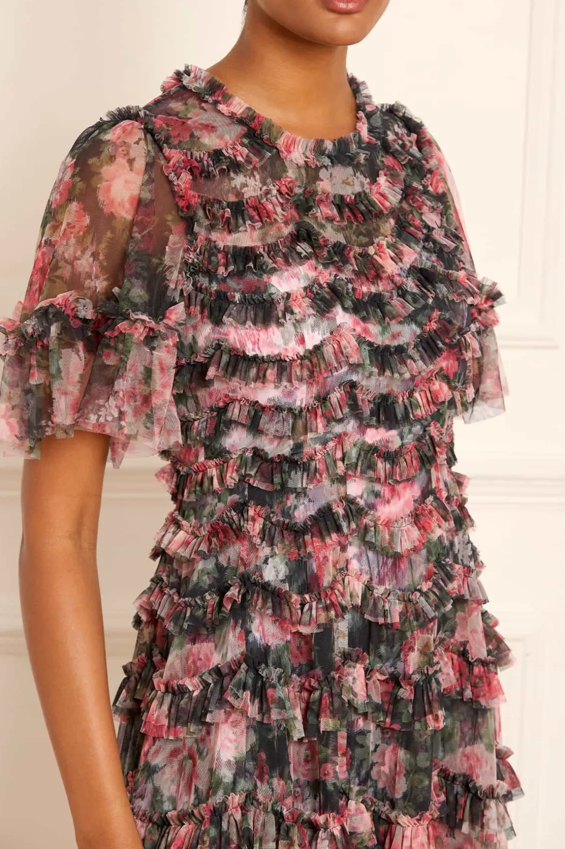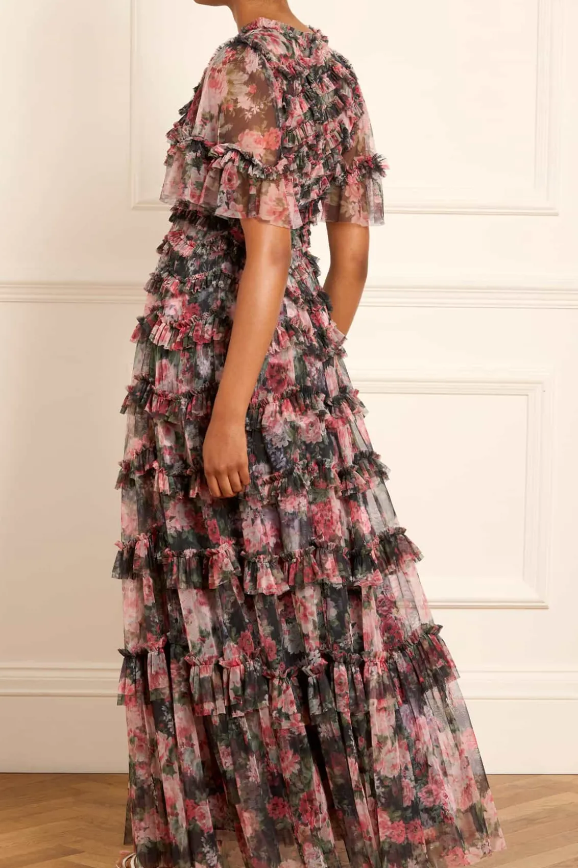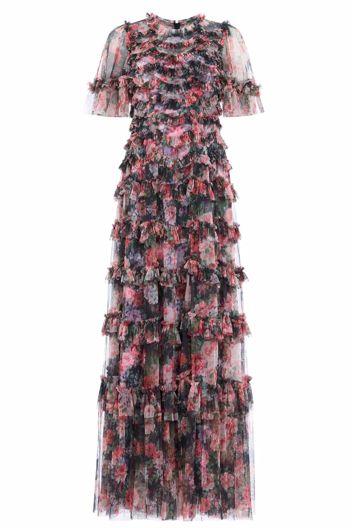 The Midnight Dance Round Neck Gown in Graphite. Beautifully printed with a floral design featuring luxurious blooms taken from archive, hand-painted artwork from the early 1900s. This style features pretty, engineered ruffle details perfectly positioned and inspired by Victorian styling. Crafted in signature Needle & Thread soft tulle for a romantic look. The skirt has a flattering fit that skims the body and gently increases in fullness, creating stunning movement within the tulle.