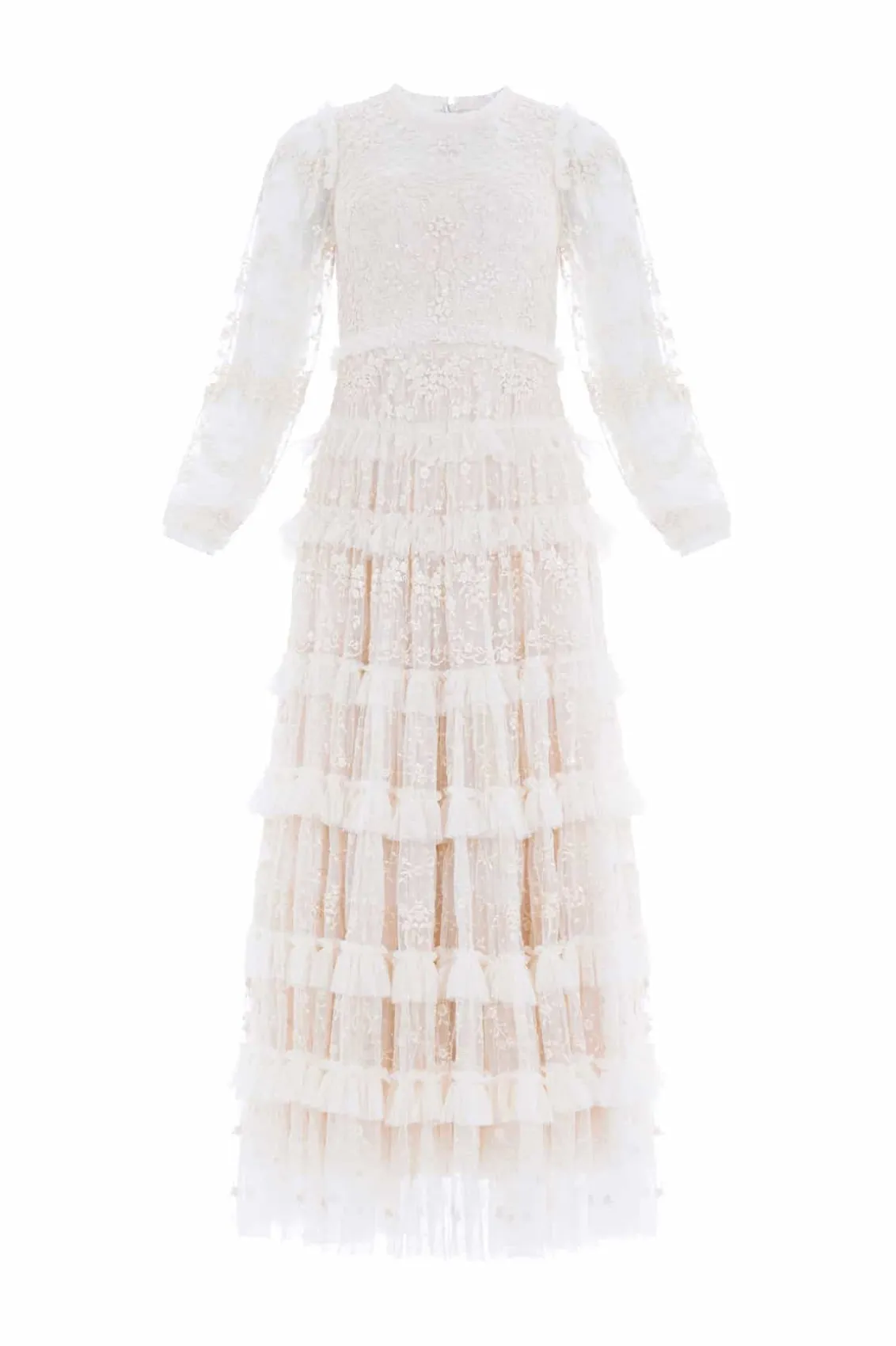The Blossom Lace Ankle Gown in Cream. Designed with a voluminous silhouette and layered frills, this gown is beautifully decorated with intricate embroidery and subtle clear sequins. A statement piece with a net layer to accentuate its dramatic silhouette. A truly show-stopping style.