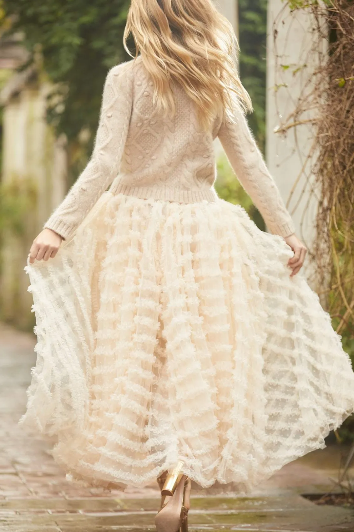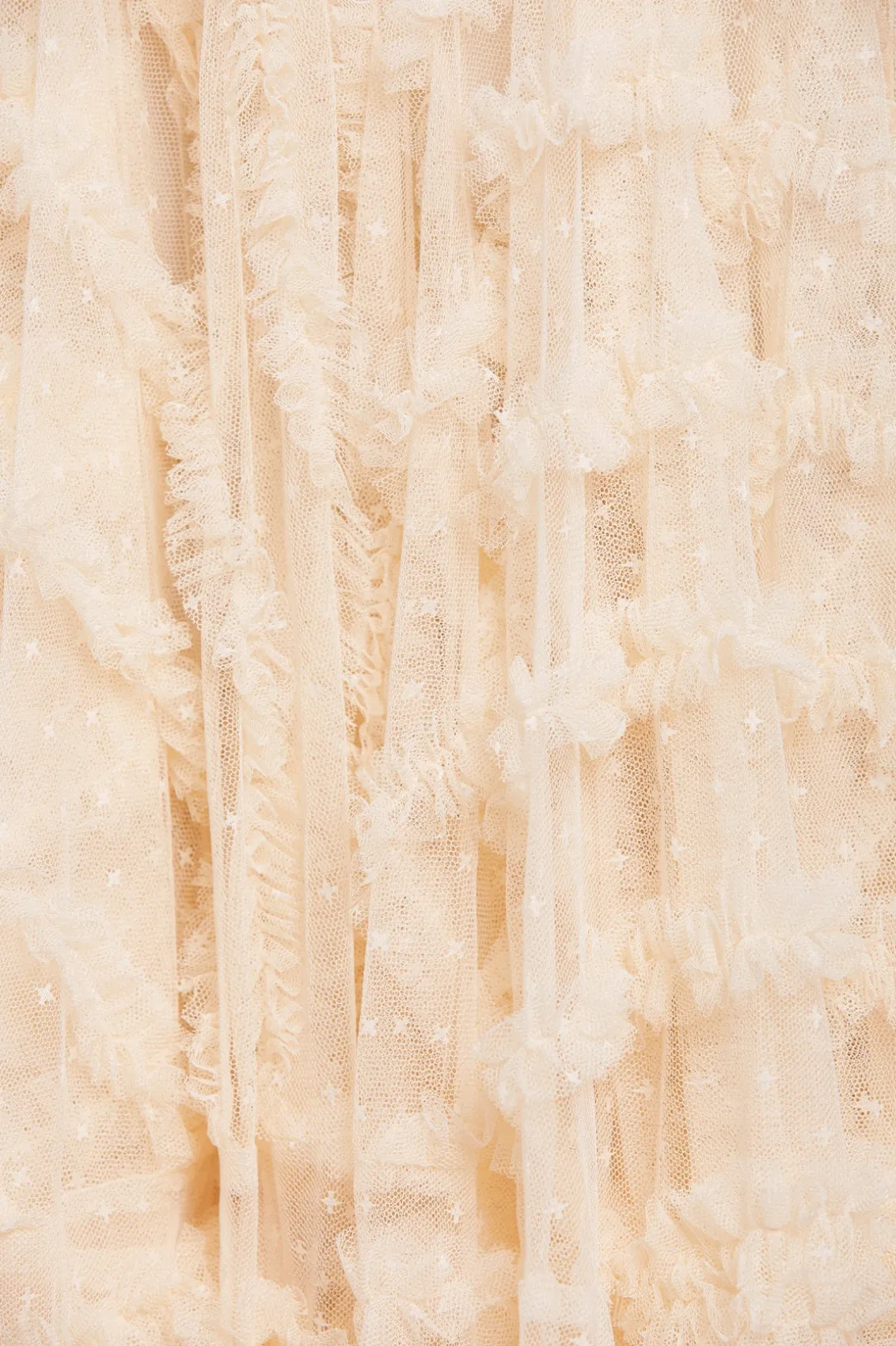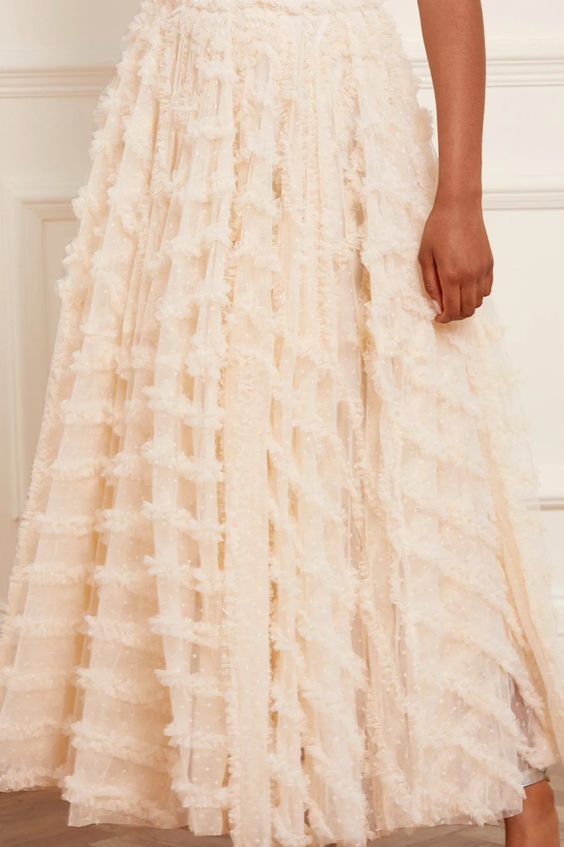 Meet the Florence Ruffle Ankle Skirt in Champagne. This beautiful skirt is crafted with layers of kisses tulle, creating a voluminous romantic look. This ankle-length skirt is designed elegantly with a satin waistband and gathered neatly with tulle trims. Pair with your favourite knit and make an entrance this season.
