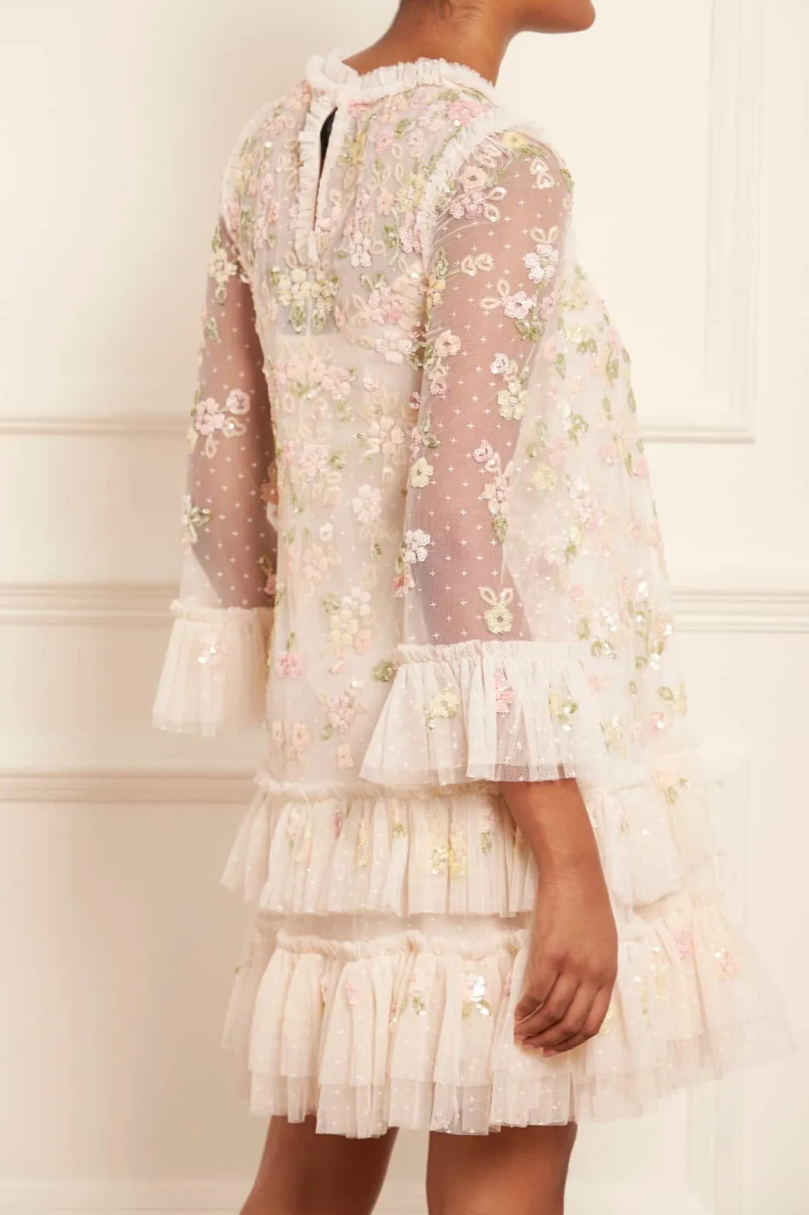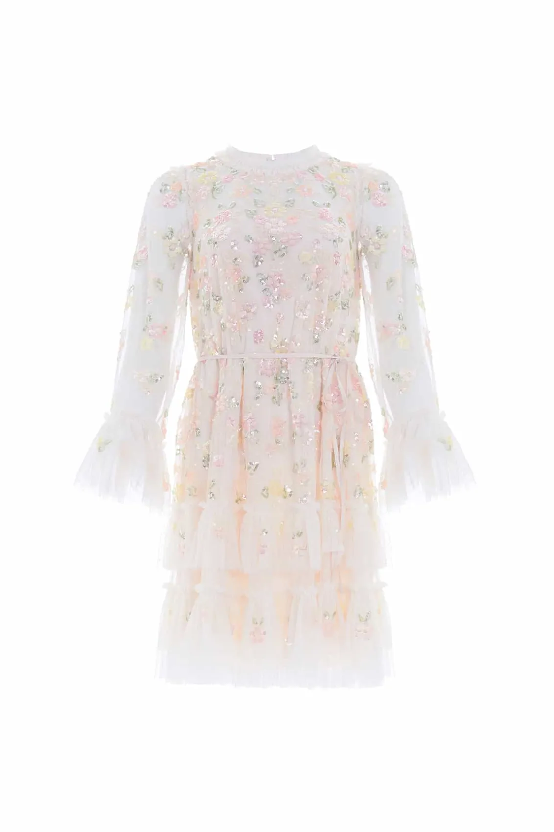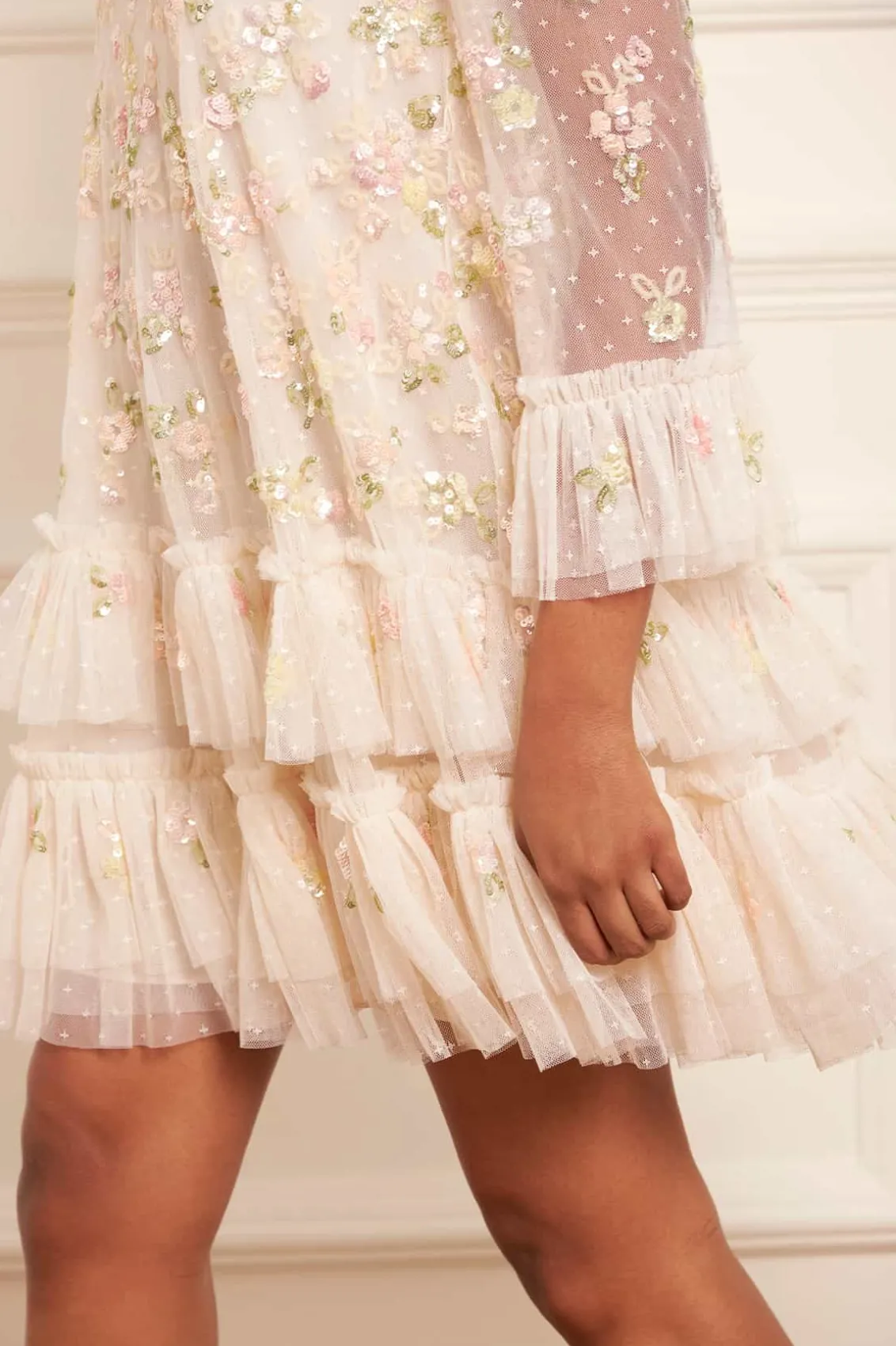 The Sequin Bloom Gloss Mini Dress in Cream. This mini dress is decorated with floral motifs that cascade down the dress in shimmering sequins. Designed with a flattering silhouette in a loose shape, creating a romantic, effortless style. This dress has a gathered panel at the hem and cuffs for signature Needle & Thread detailing. Make this dress your new wardrobe favourite.
