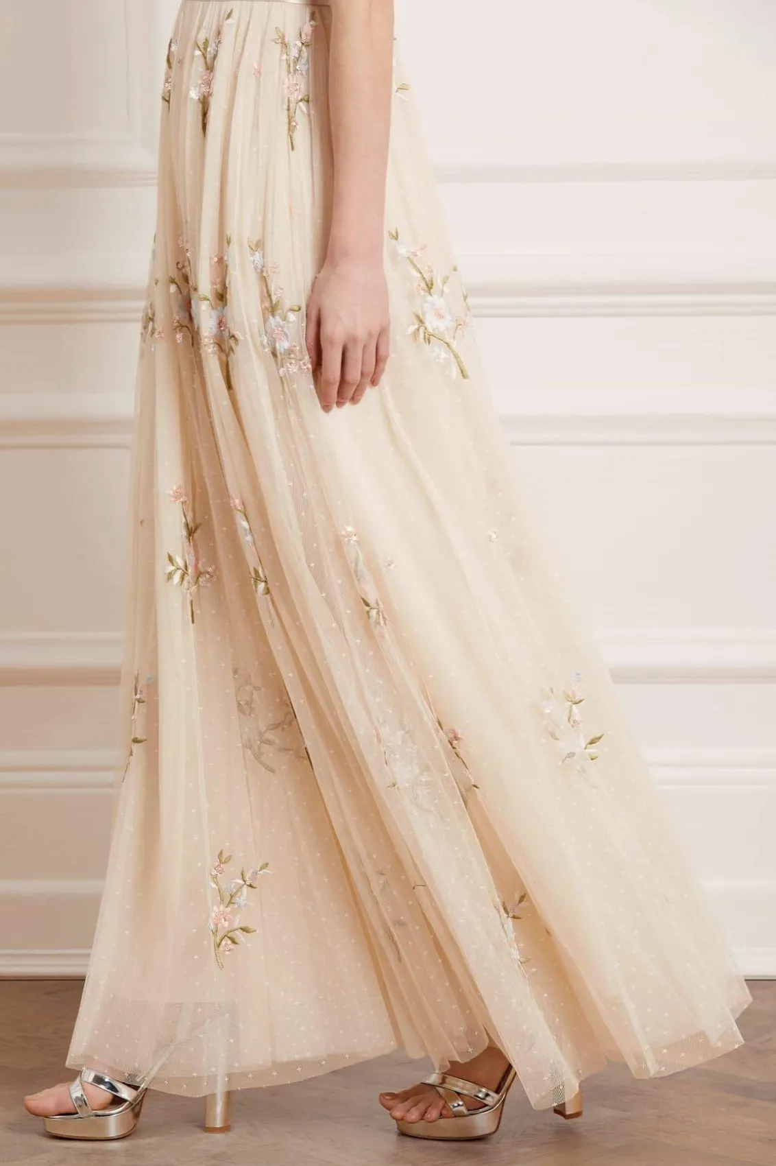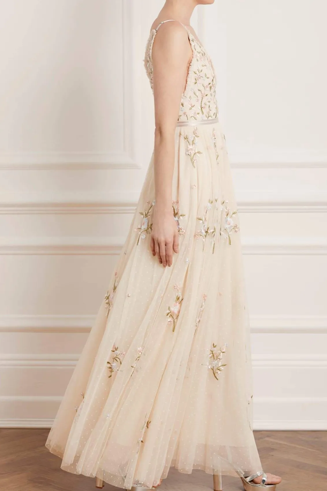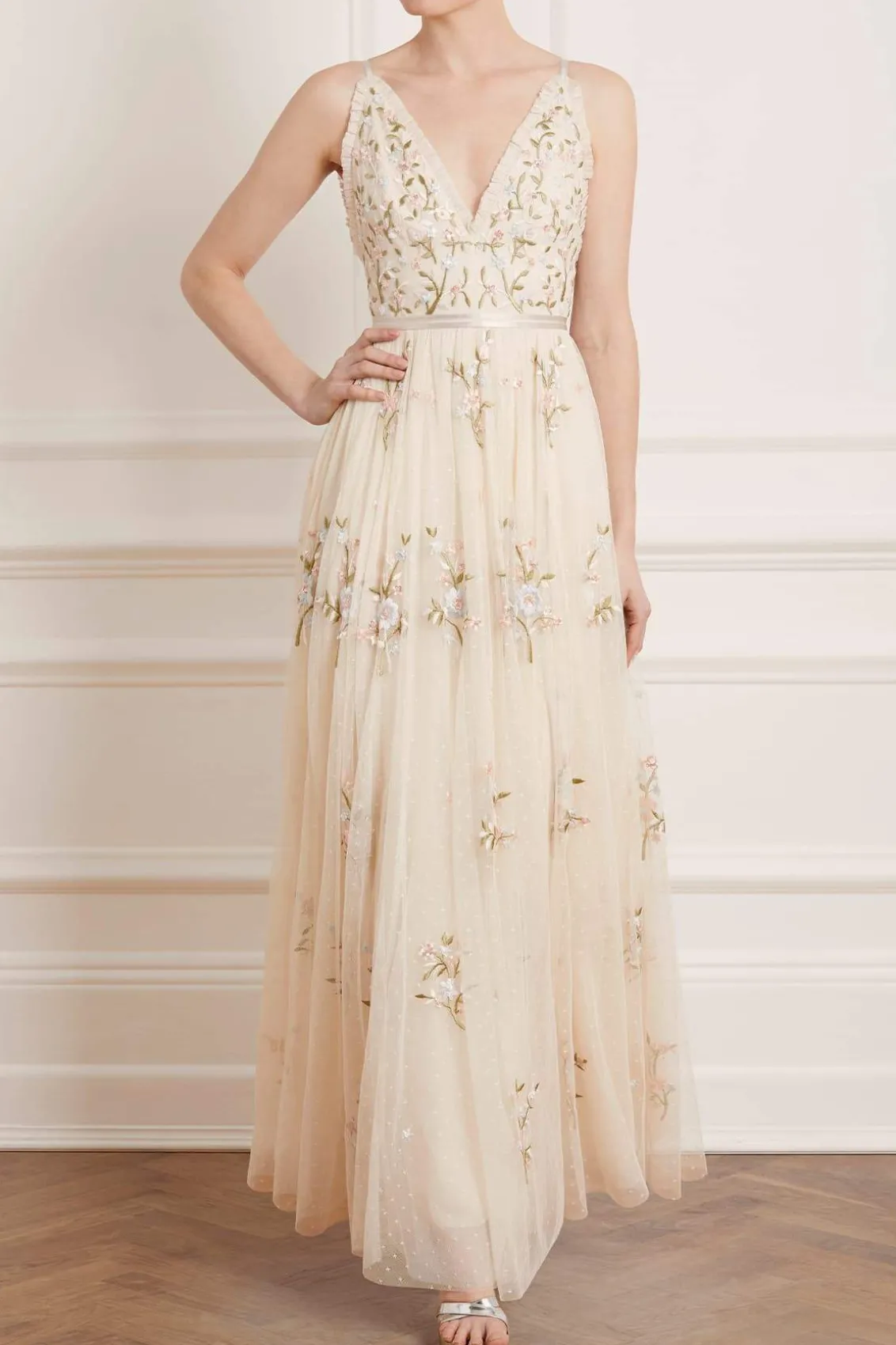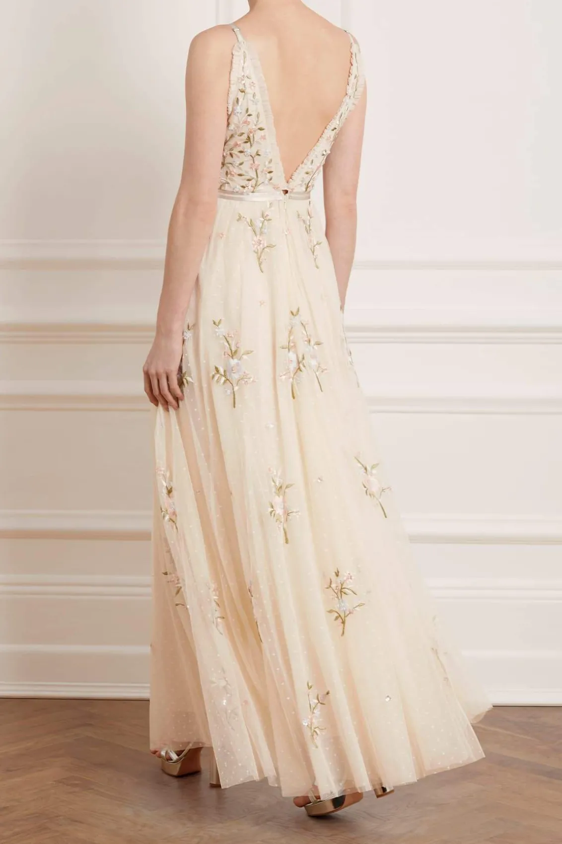 – Form fitted bodice with a plunging neckline and a multi-layered full skirt