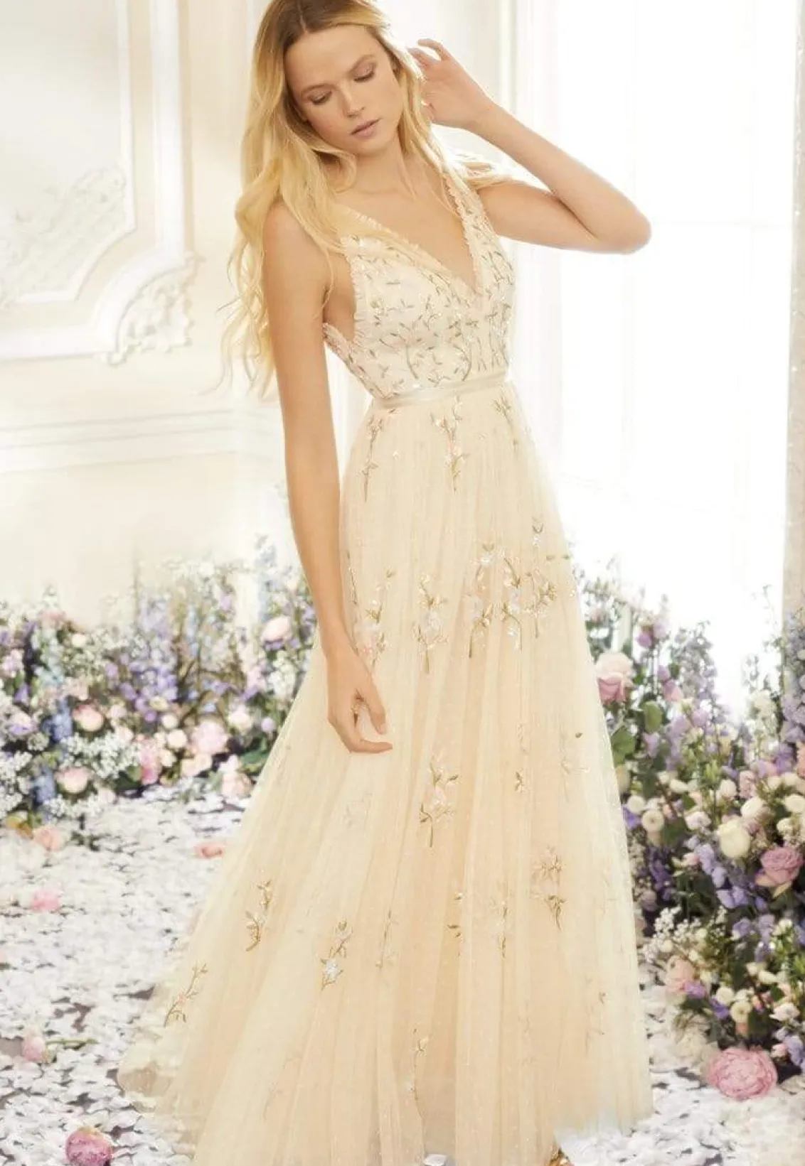 – Form fitted bodice with a plunging neckline and a multi-layered full skirt- Delicate dry clean only