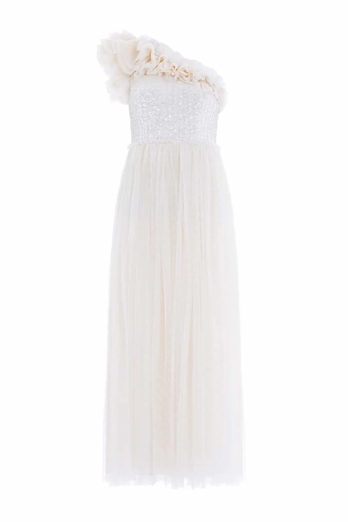 The Raindrop Bodice One Shoulder Ankle Gown in Cream / Cream. The bodice of this gown is adorned with an enchanting sequin artwork. The artwork is designed with delicate shimmering polka dot sequins in a linear formation capturing the essence of glistening raindrops. Designed with an off-the-shoulder style for elegant detailing. The skirt is made from layers of frothy tulle featuring statement frill details, creating a signature romantic look. The gown is perfect for an upcoming special event.