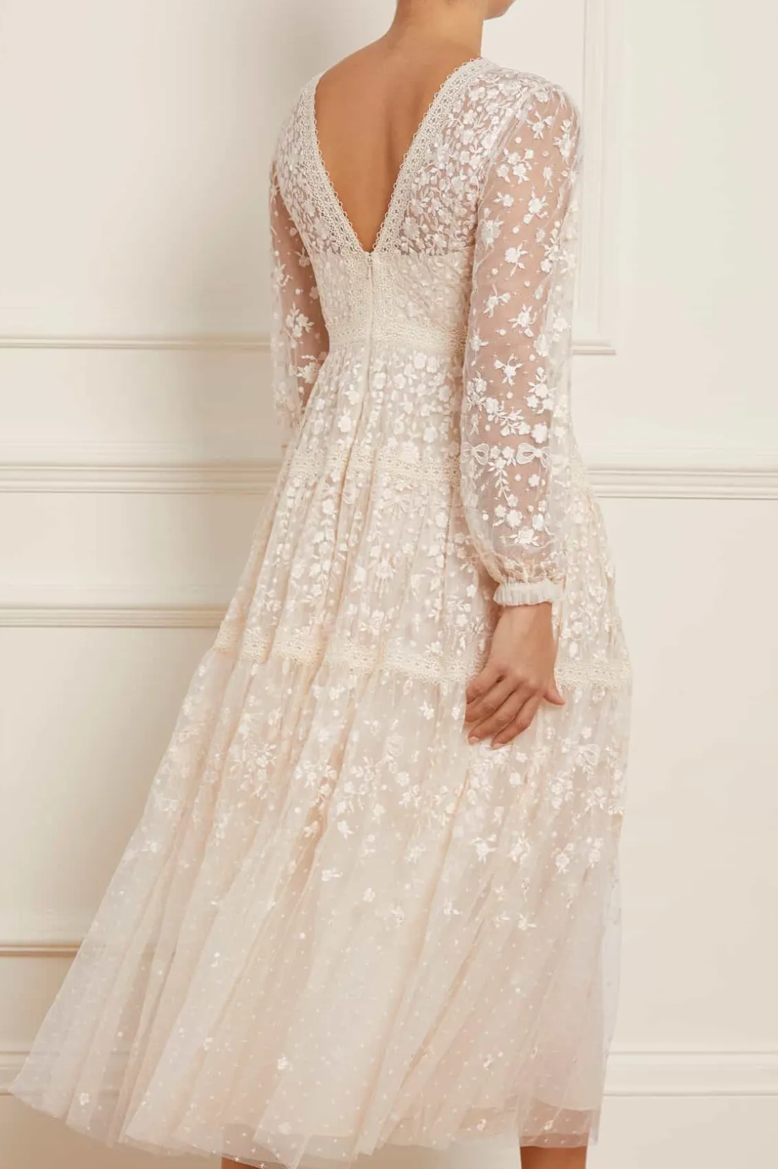 The Celestia Ribbon Gown in Champagne. This gown has been intricately designed with rich embroidery inspired by vintage lace, featuring delicate floral motifs and ribbon bows throughout. Crafted with pretty lace trims for signature Needle & Thread detailing, and delicately constructed with a textured tulle fabric base. Featuring a V-shaped neckline and a new, ultra-flattering silhouette. Make the ultimate statement in the Celestia.
