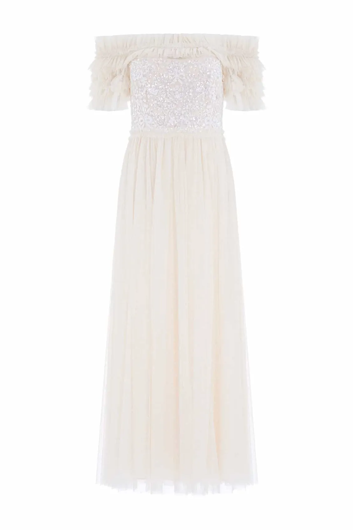 The Sequin Wreath Bodice Off-Shoulder Ankle Gown in Cream. This beautiful gown is crafted with an iconic off-the-shoulder design. Adorned with layers of delicate ruffles, along with an elasticated panel for comfort and hold. The bodice is beautifully decorated with shimmering sequins inspired by a vintage lace curtain. Designed with a romantic layered tulle skirt for signature Needle & Thread styling. A perfect gown for a special occasion.