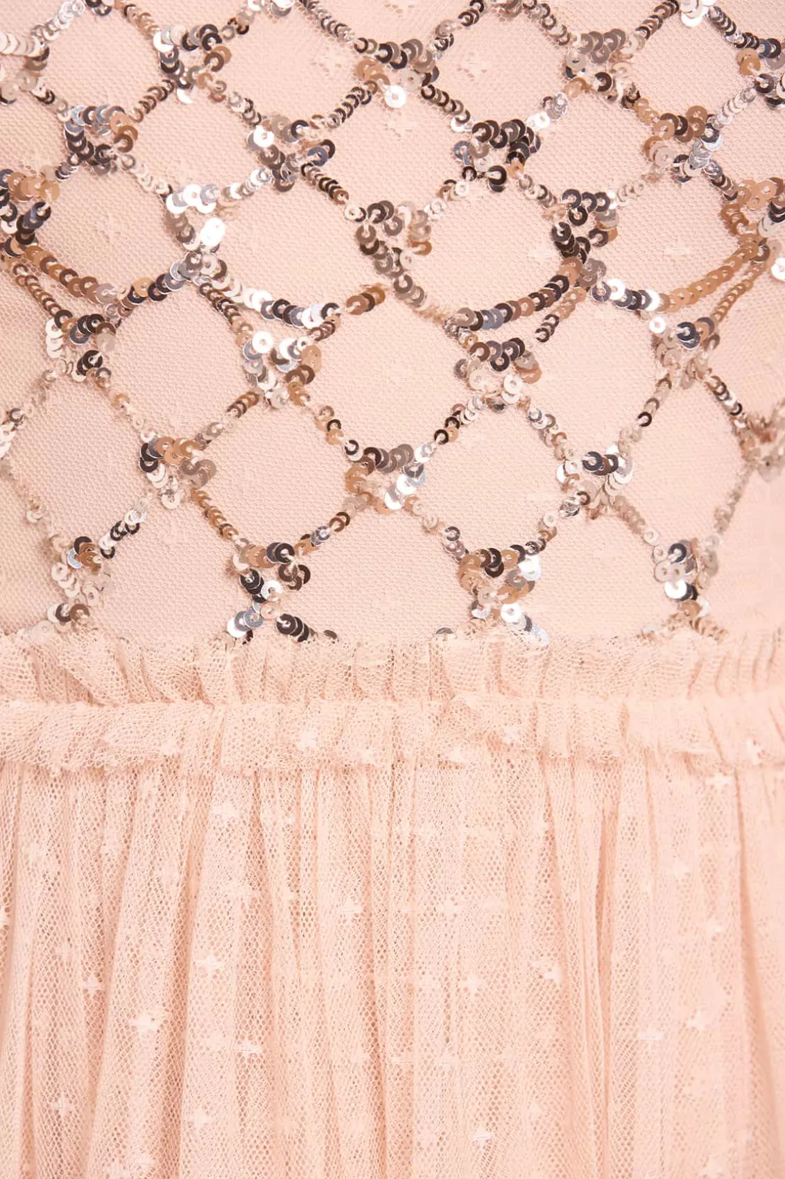 The Heart Lattice Bodice Cape Ankle Gown in Dust Beige/Silver. The bodice of the gown is decorated with intricate embellishments made using the smallest sequins for exquisite detailing. Beautifully designed with heart-shaped motifs in a lattice layout. Developed with signature Needle & Thread soft tulle trims and a layered skirt for romantic detailing and a statement look. The perfect gown for a bridesmaid moment or an upcoming special occasion.