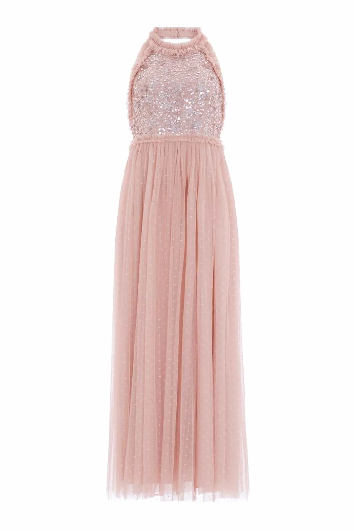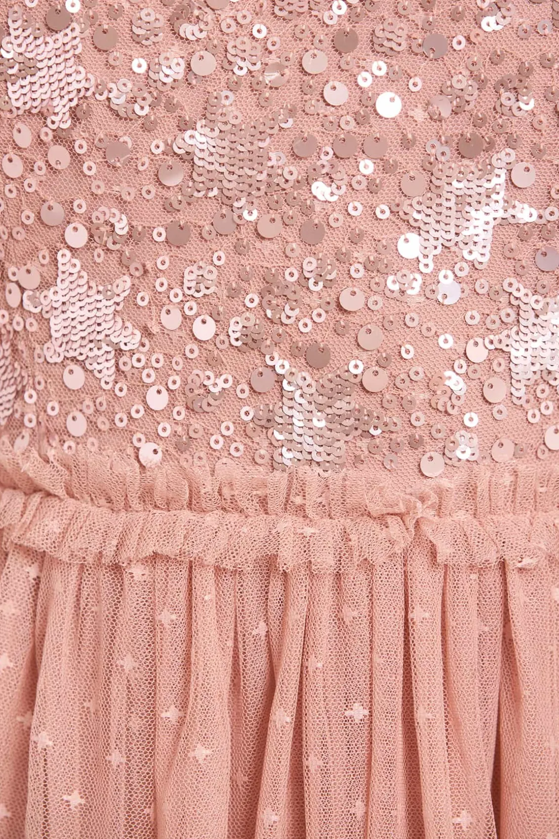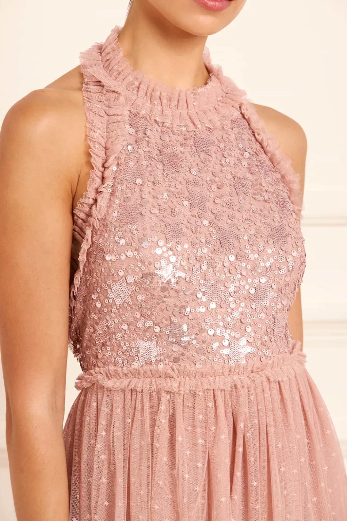 The Shooting Stars Bodice Halter-Neck Ankle Gown in Rose Gold. This gown is inspired by the extravagant costumes worn by the Follie’s dancers of the early 1900s. The bodice of the gown is decorated with shimmering embellishments of intricate star motifs with scatters of tiny glittering sequins that evoke the beauty of a night sky. Designed with a halter neck and frothy signature Needle & Thread soft tulle ruffles. The skirt is developed from layers of signature Needle & Thread soft tulle. The perfect gown for an upcoming special occasion or bridesmaid moment.
