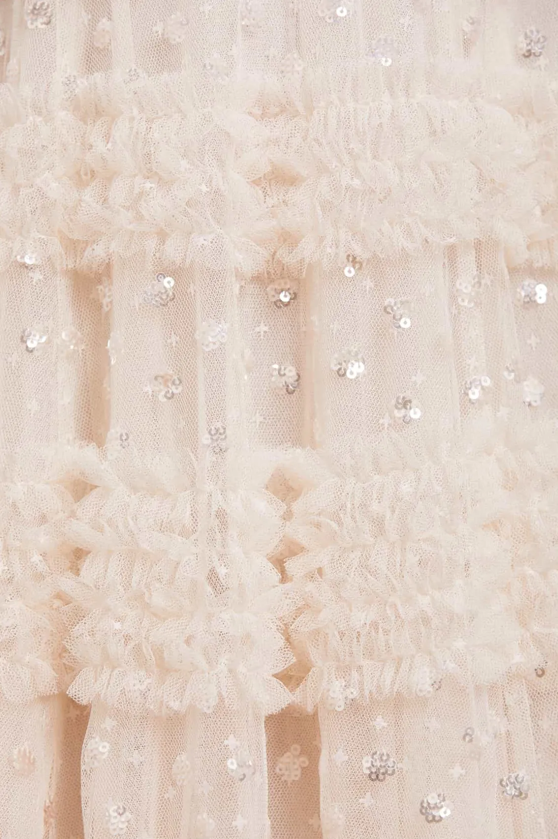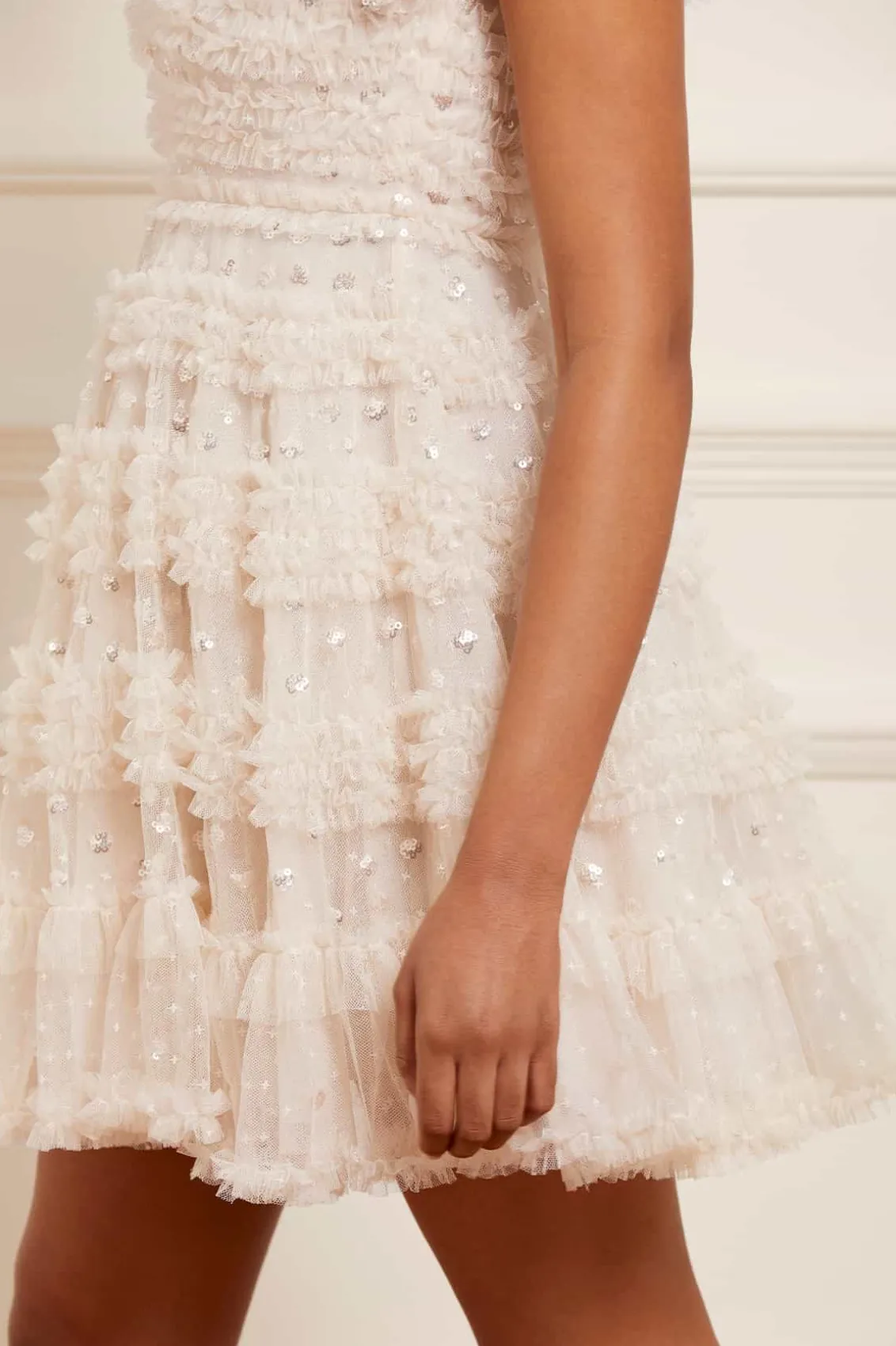 The Vivian V-Neck Micro Mini Dress in Cream. A signature Needle & Thread style statement. Beautifully printed with sequin polka dot motifs scattered throughout, creating an enchanting shimmer. Adorned with specially sourced sequins to create a sparkling effect throughout. This romantic style features tulle frills in perfectly positioned rows, creating a soft, frothy texture. Developed with generous ruffled sleeves and a V-neckline for a contemporary look. A style you’ll wear time and time again.