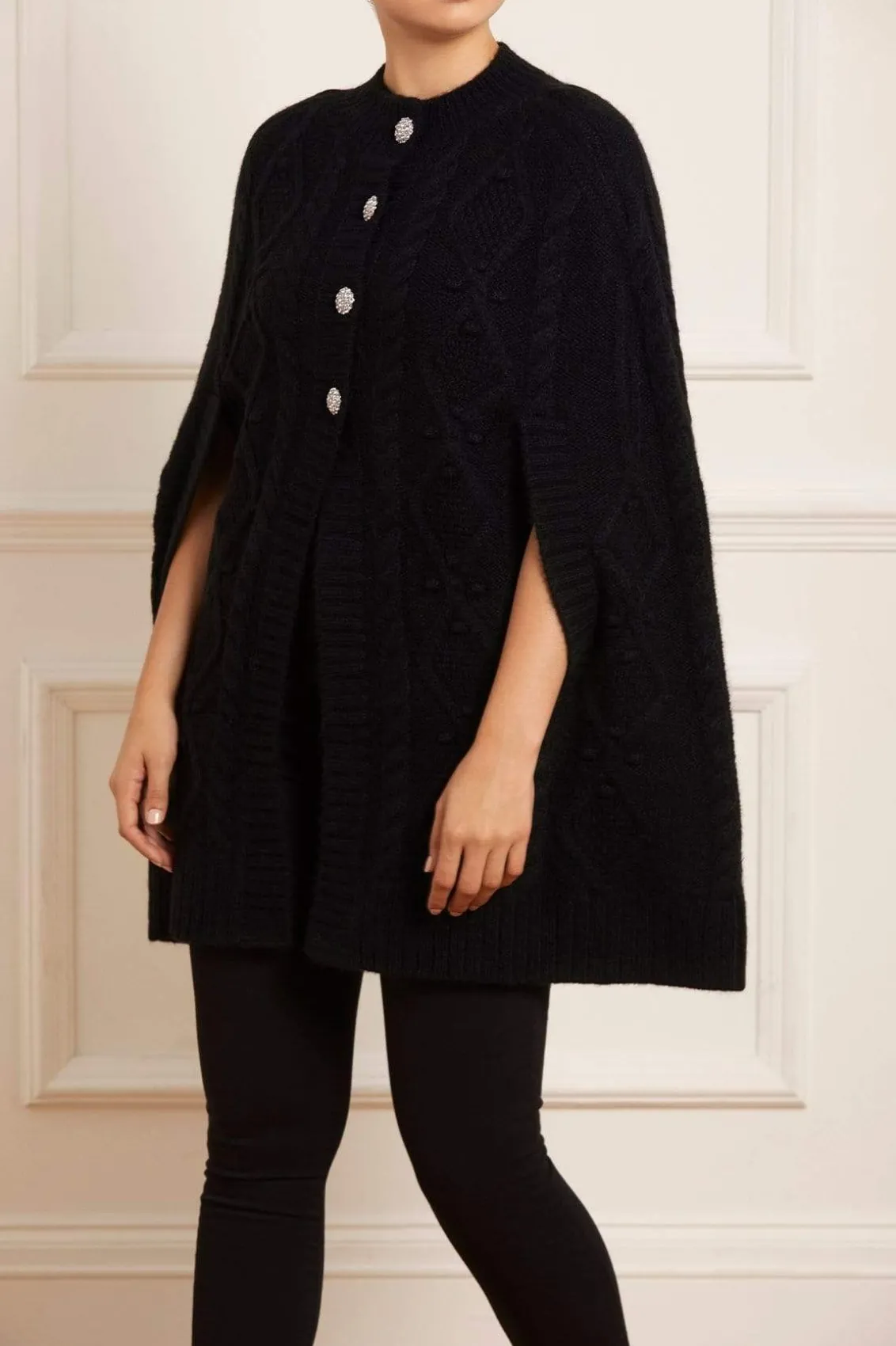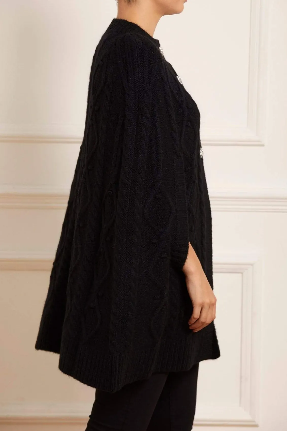 NEEDLE & THREAD EXCLUSIVE. The Sylvie Cable Jewelled Knee Length Cape in Jet Black. This cape is developed from alpaca yarn, creating a cosy feel with a fluff texture finish. Adorned with jewelled diamante buttons down the front of the cape, creating a subtle shimmer. This easy styling piece is decorated with mixed cables in diamond and twist textiles throughout. Designed with long sleeves, split openings and volume to create a romantic style statement. A key statement piece of the season.