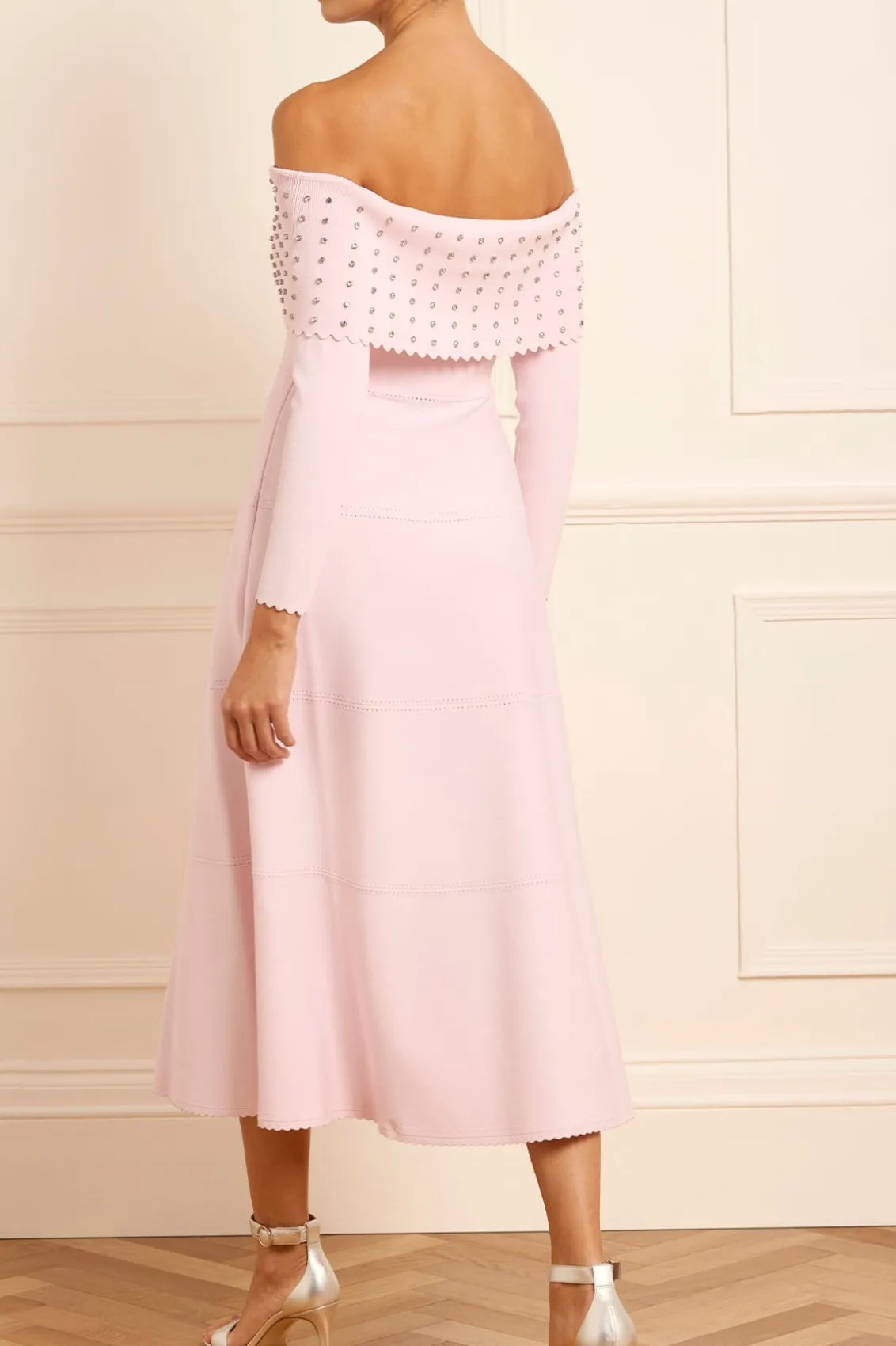 NEW SEASON. The Embellished Bardot Knit Gown in Pink. This knitted gown is developed from a recycled viscose blend, with stretch yarn for a beautiful, flattering texture. It features a fitted stretch bodice, a feminine bardot neckline, slim sleeves, and scalloped trim details for a romantic look. The bardot neck is beautifully adorned with crystal gems in a linear pattern for a signature Needle & Thread feminine touch.