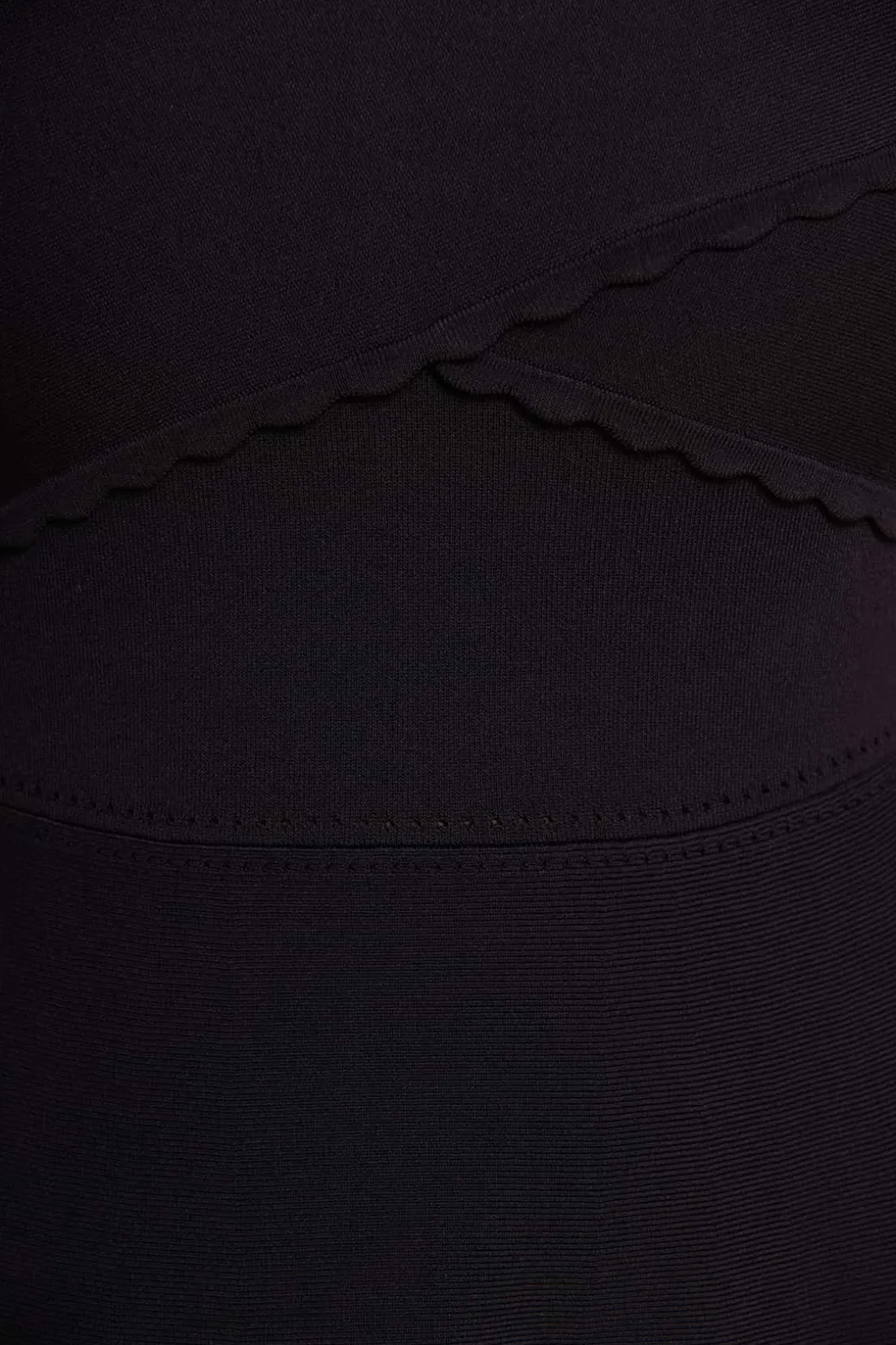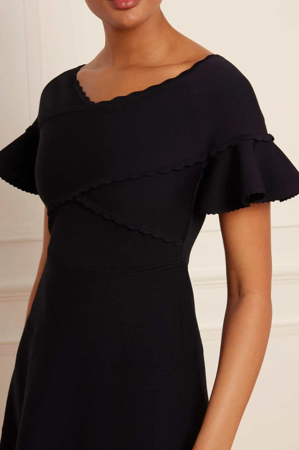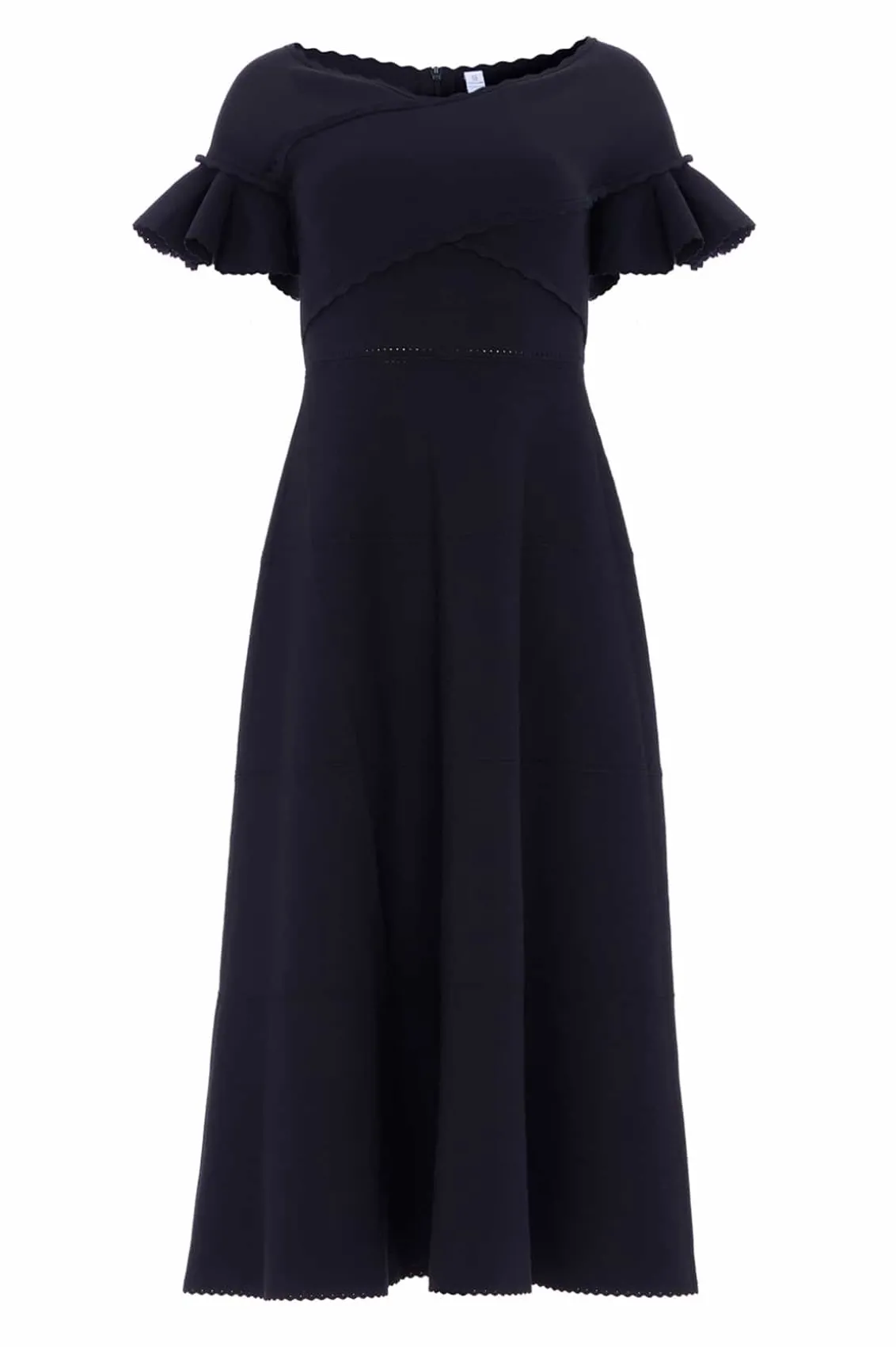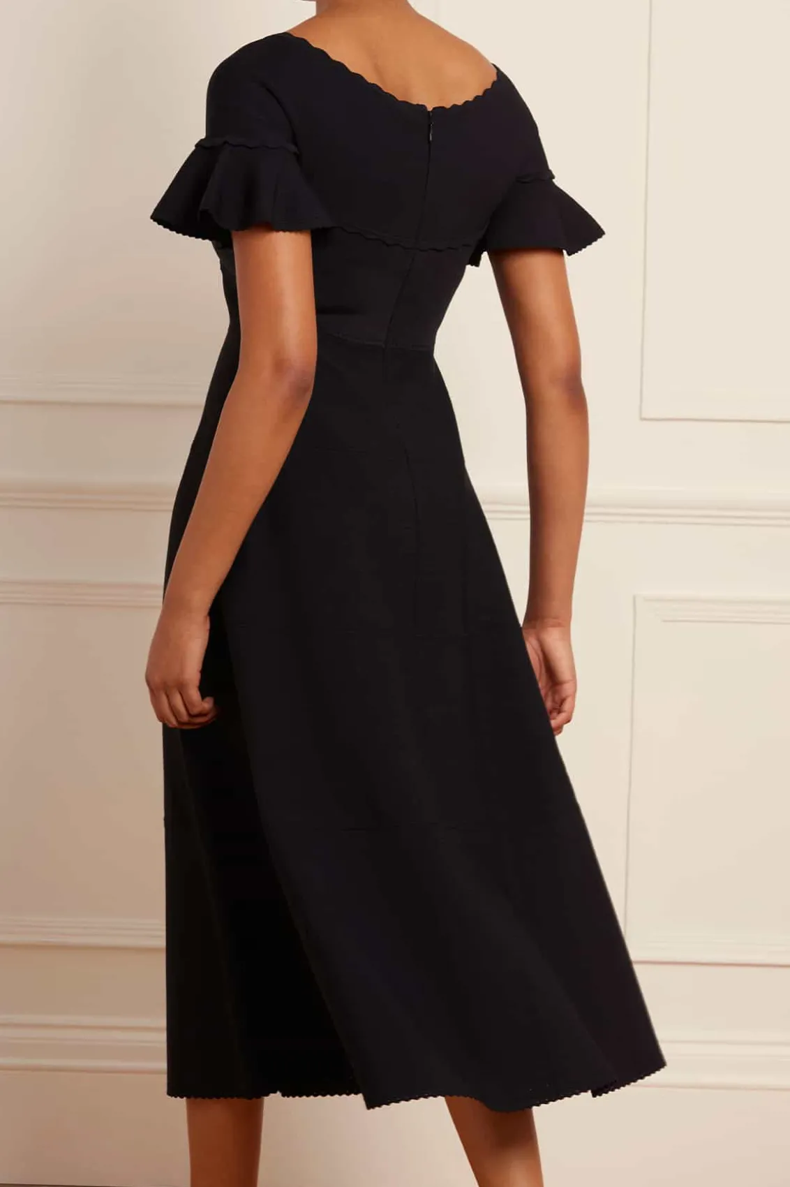 The Wrap Front Knit Gown in Black. This knitted gown is developed using a recycled viscose blend fabric which creates a beautiful, flattering fit. Created with a stretch fitted bodice with a wrap detail featuring signature Needle & Thread scallop trims. This knitted gown is crafted with an open neck, fluted feminine sleeves and Needle & Thread scallop detailing for a signature look. The perfect transitional style.