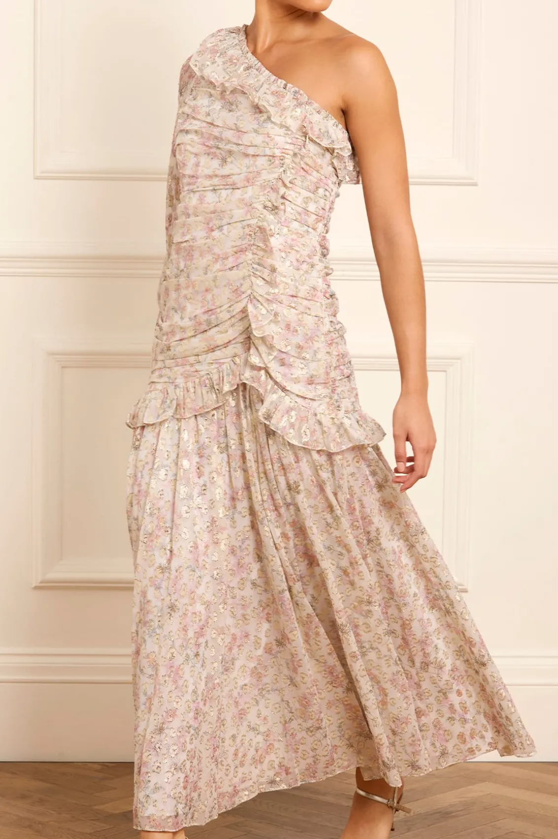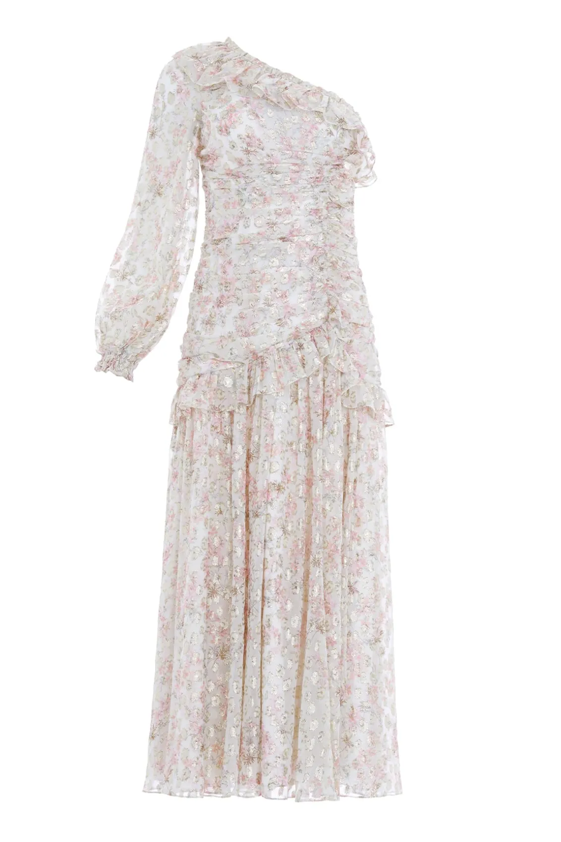 NEW SEASON. The Ophelia Ditsy Lurex One-Shoulder Ankle Gown in Moonshine/Pink. This romantic trailing print is taken from an archive, hand-painted artwork from the early 1900s, depicting soft, whimsical ditsy floating florals. This playful one-shoulder gown boasts a flattering gathered ruche detail engineered across the body and adorned with signature Needle & Thread frill detailing. Designed with a blouson sleeve featuring a ruffle cuff and romantic frills. The slim silhouette features a dropped waist seam with a flirty frill tier. The stretch lining fabric ensures fit and comfort. The perfect gown for an upcoming occasion.