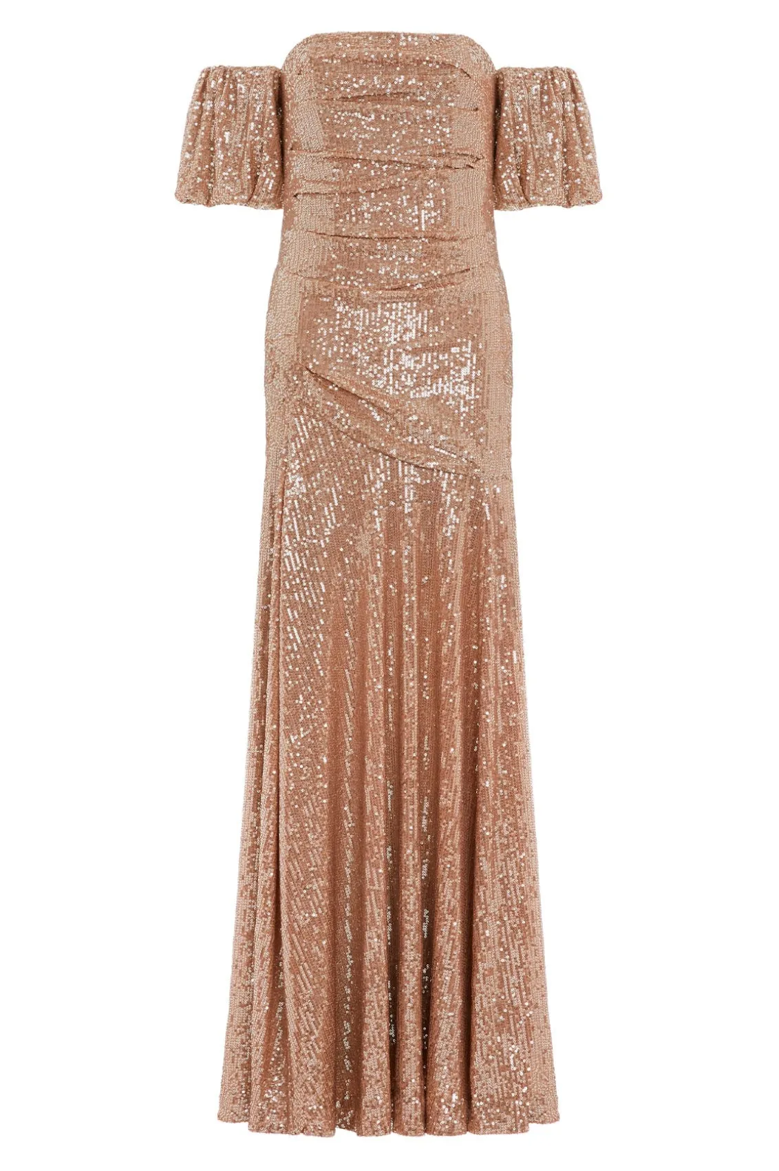 NEW SEASON. The Sunbeam Valentina Off-Shoulder Gown in Mocha. Turn heads in the dazzling gown. Featuring shimmering 3mm sequins on stretch mesh, an off-shoulder silhouette, and a fluid skirt, this design exudes timeless elegance. Crafted with romantic puff sleeves and soft draping flatter the figure, while an internal corset ensures comfort and support. Perfect for glamorous soirées, this gown promises unforgettable sophistication.