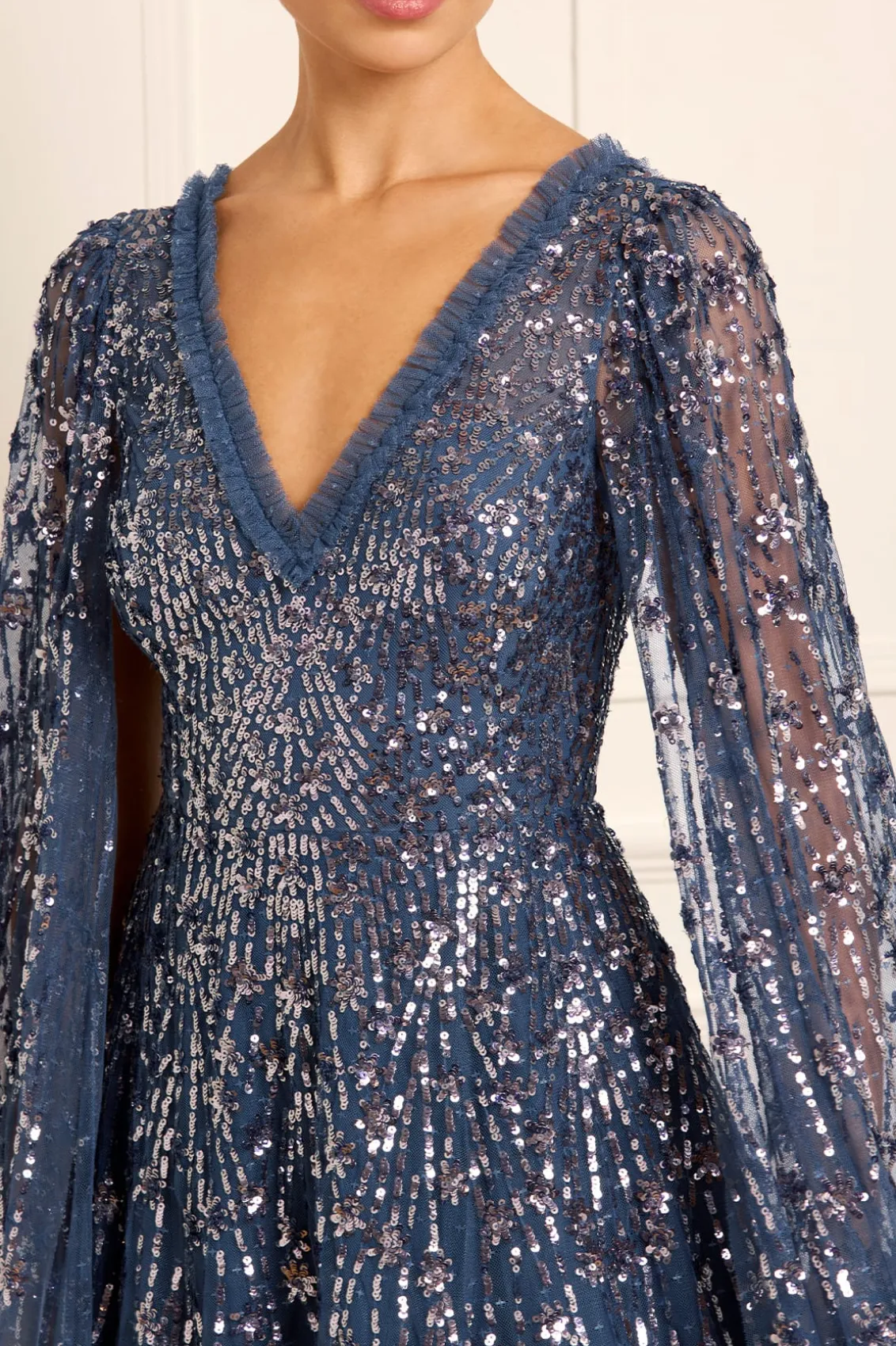 NEW SEASON. The Comet Ankle Gown in Indigo. This beautiful statement piece showcases glittering sequin shooting star motifs, inspired by the night sky, with embellishments that delicately trail down to the hem. This gown features our new floor-length cape, adding an element of romantic elegance. The skirt is crafted from layers of net and tulle, creating a full, voluminous silhouette. The sequins have a special high-shine, gloss finish created from extra foil coating added to each sequin to create this extra lustrous look. Make a memorable appearance in the Comet Ankle Gown.