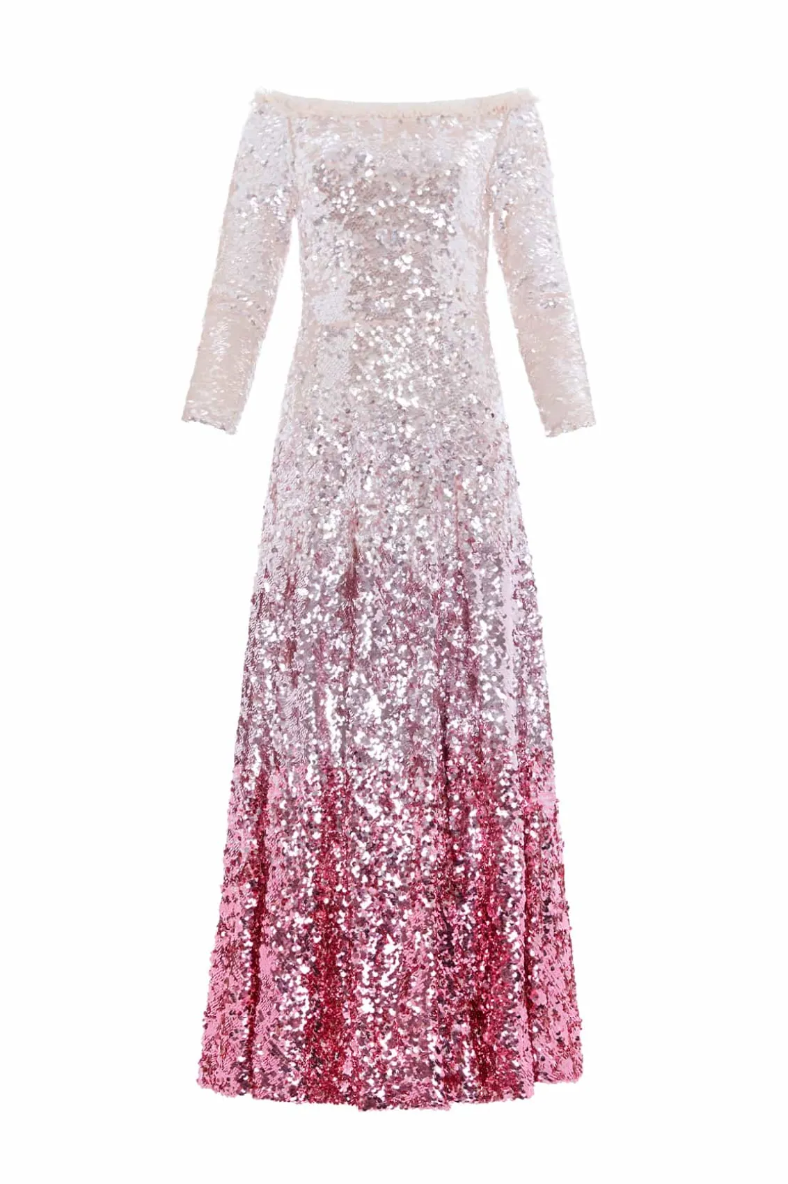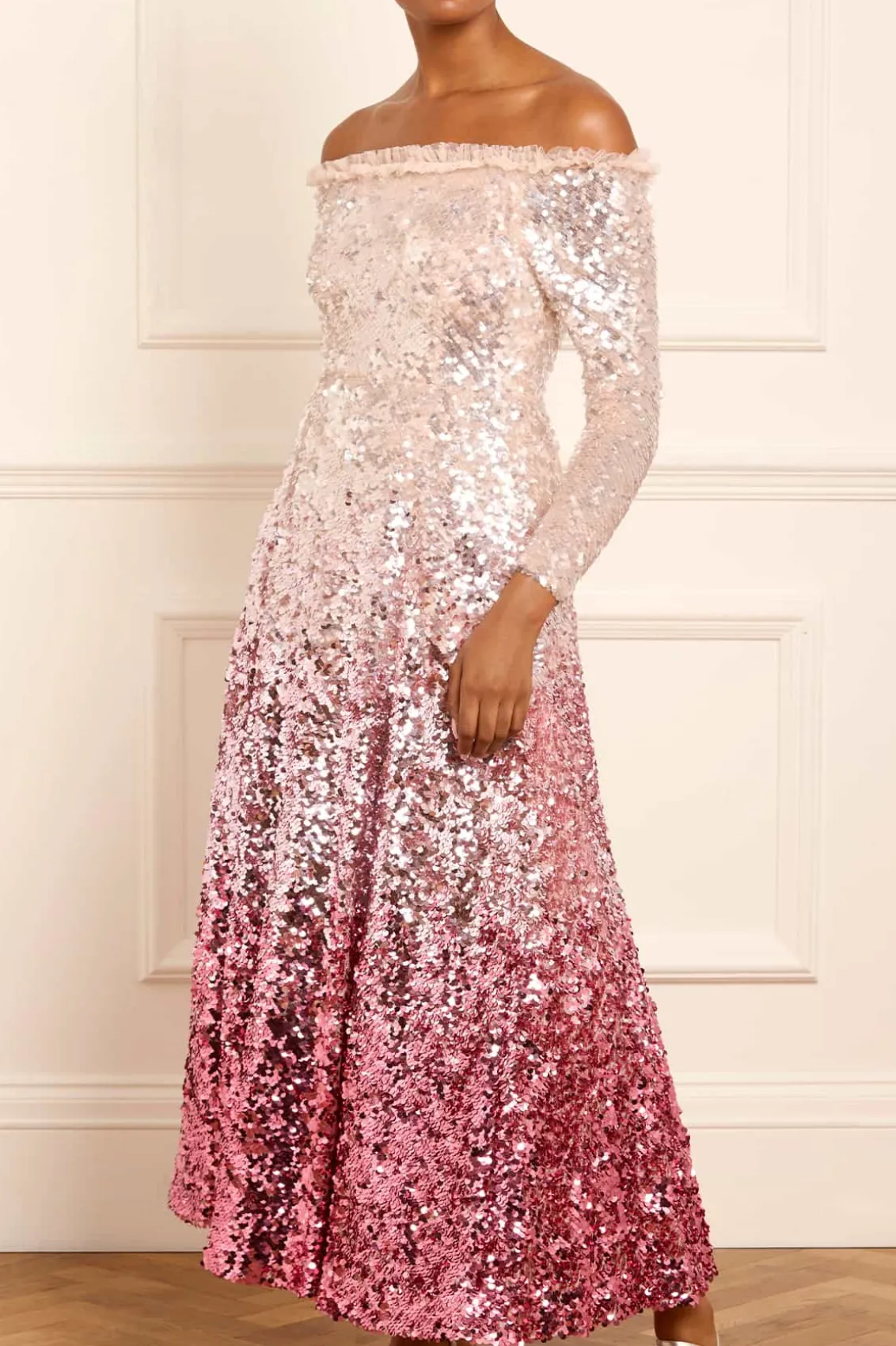 The Hallie Ankle Gown in Bright Pink. This elegant gown features a glamorous Hollywood-inspired neckline adorned with our signature Needle & Thread frill. Designed with slim sleeves, and a full skirt made up of layers of soft tulle, complemented by luxurious statement shimmering sequins. Developed with an internal corset construction in stretch power mesh ensures full comfort and fit while maintaining the shape and hold of the garment, featuring a mesh bralette for ultimate comfort and an easy fit. This gown is both captivating and timeless.