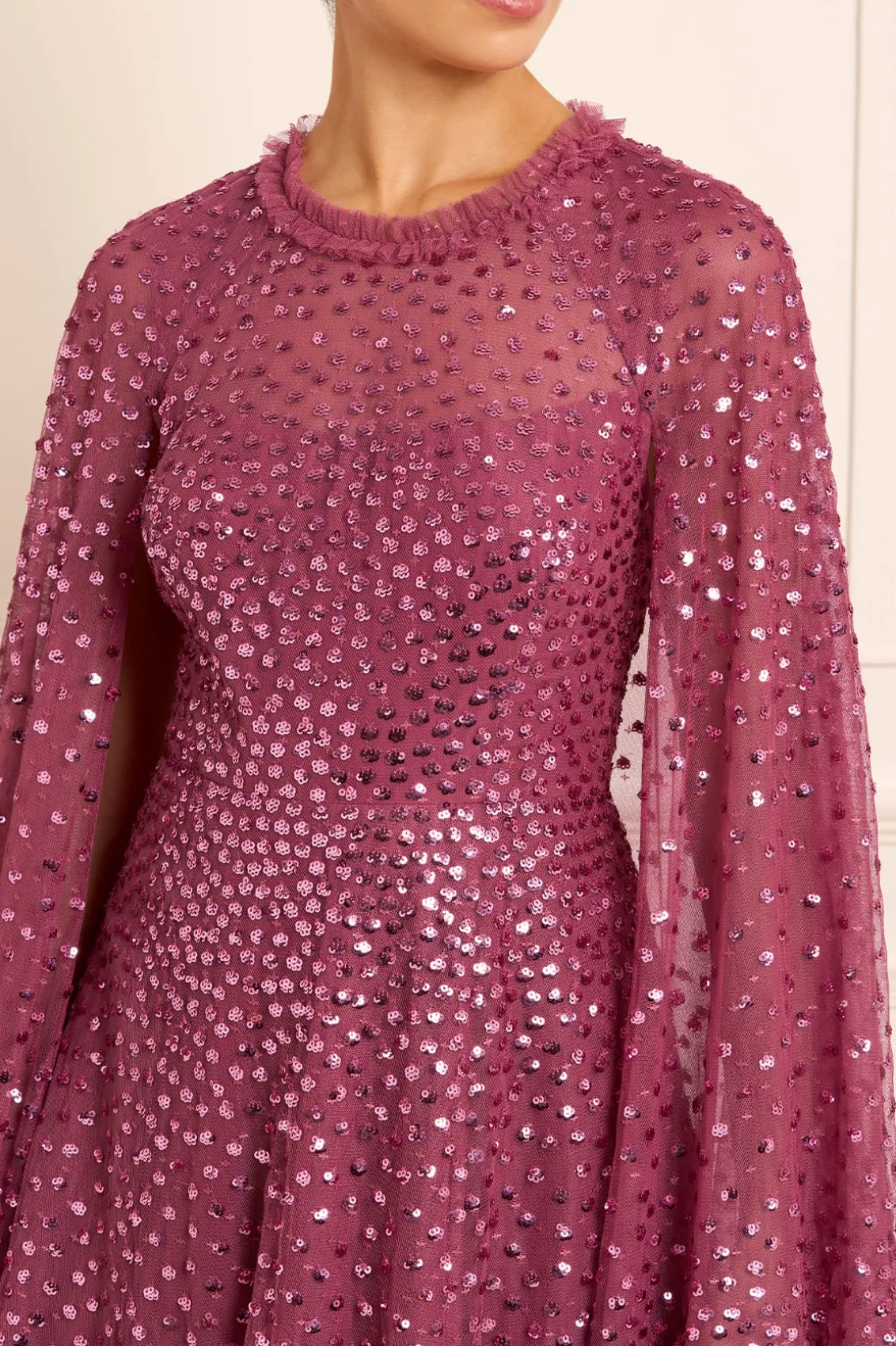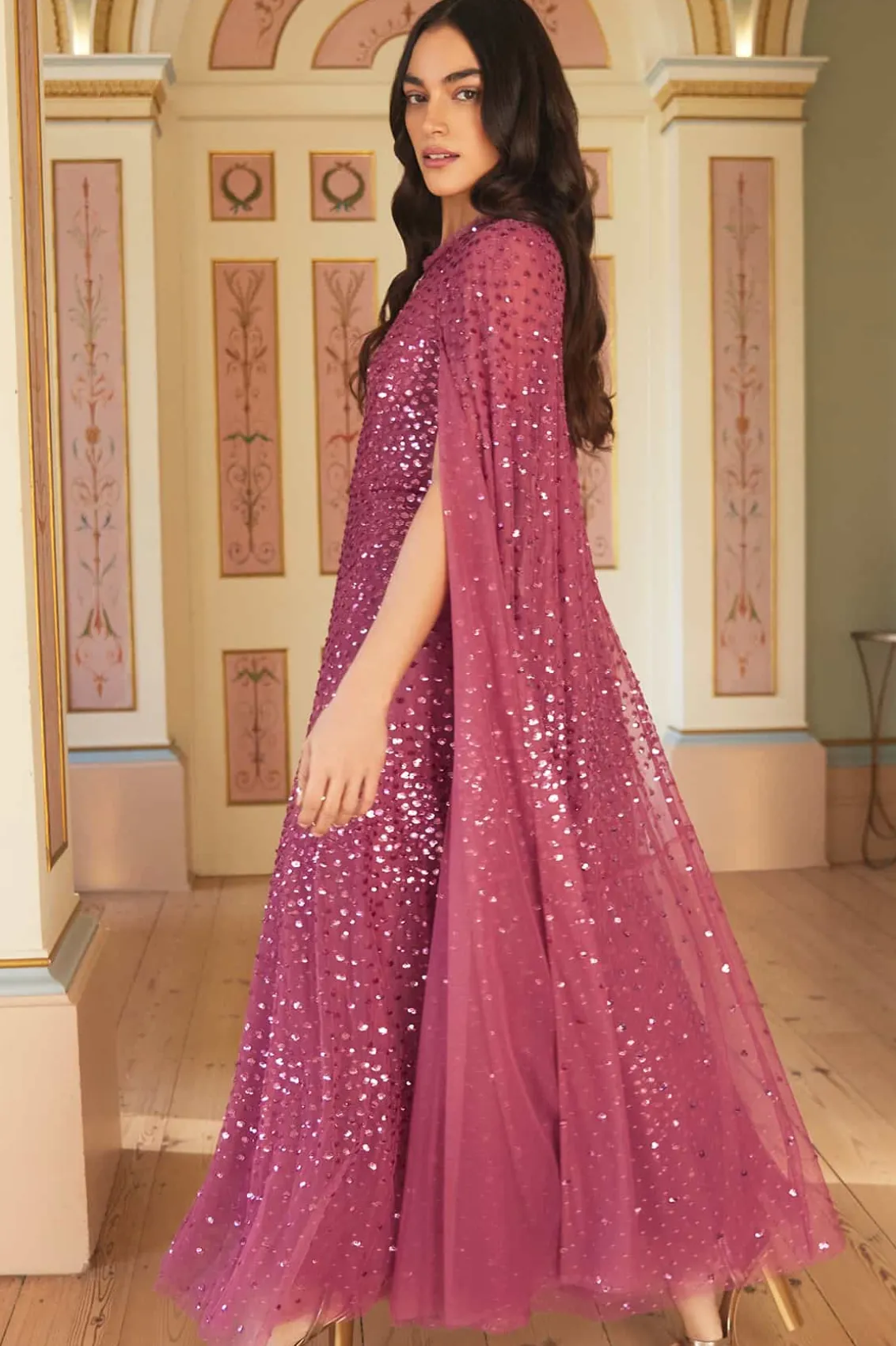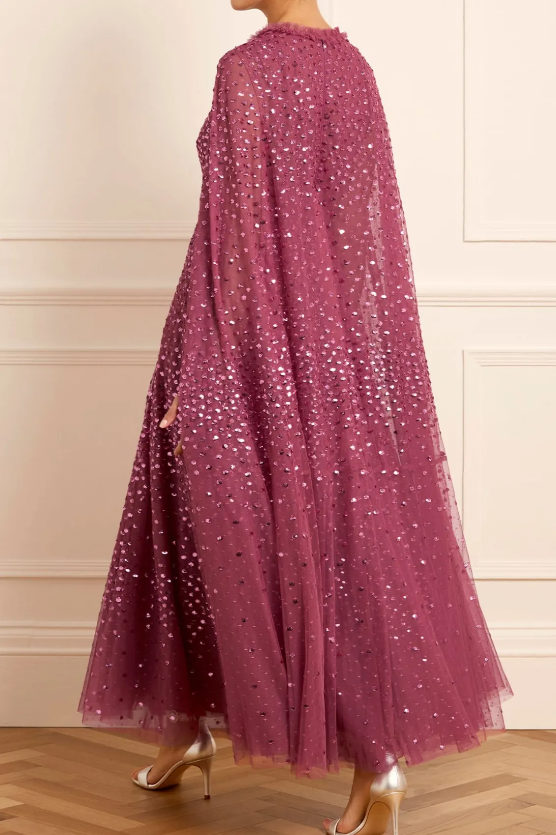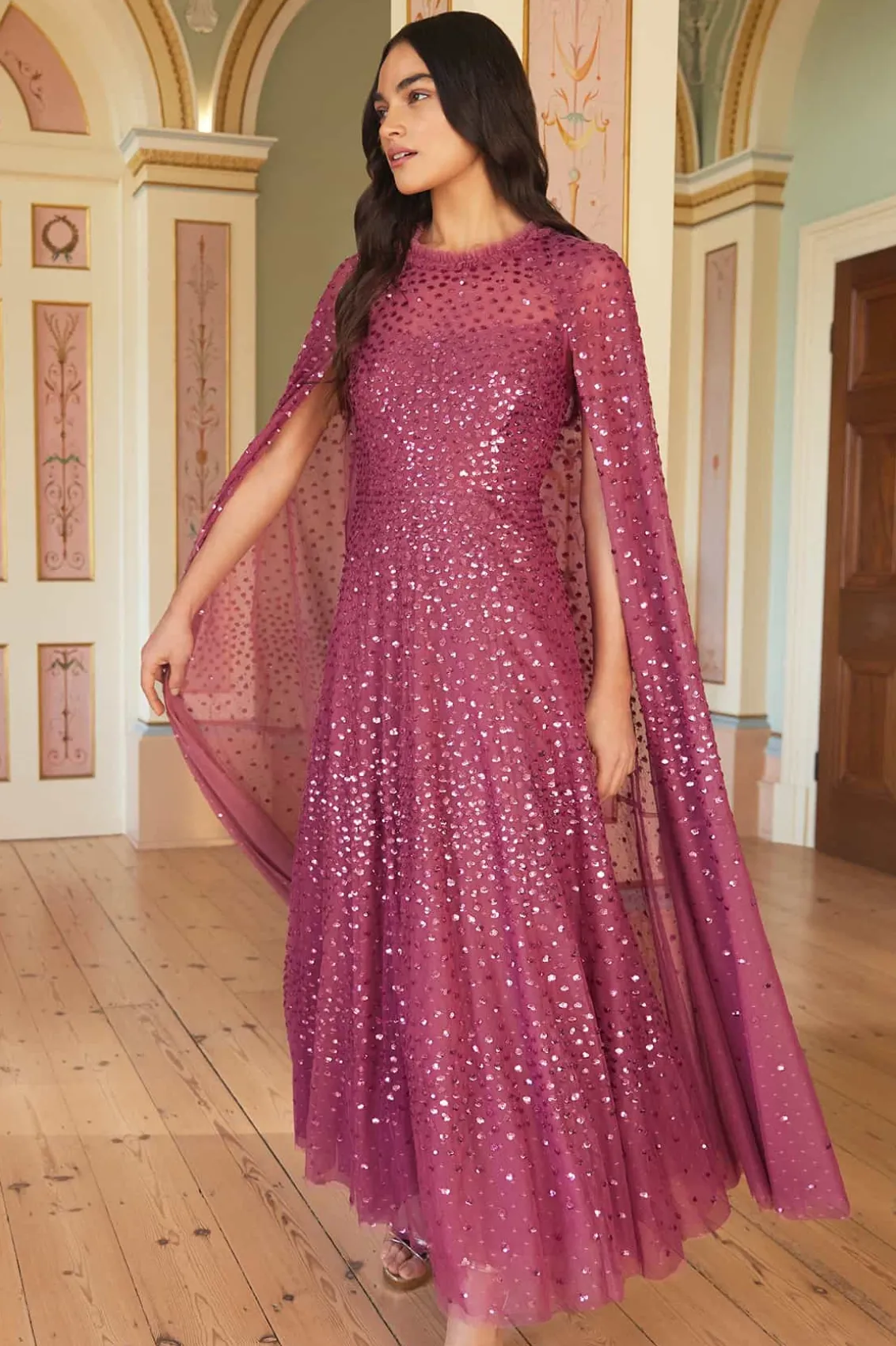NEW SEASON. The Scatter Dot Cape Sleeve Ankle Gown in Pink Topaz. This embellished gown is decorated with exquisite shimmering dot motifs, undulating in wave formations for a captivating glittering effect. Designed with a sweeping floor-length cape for romantic detailing and a statement look. The flattering square neckline is trimmed with signature Needle & Thread tulle frills. The skirt is made up of generous layers of net and tulle with a sweeping hemline. The perfect choice for an upcoming special occasion and beyond.