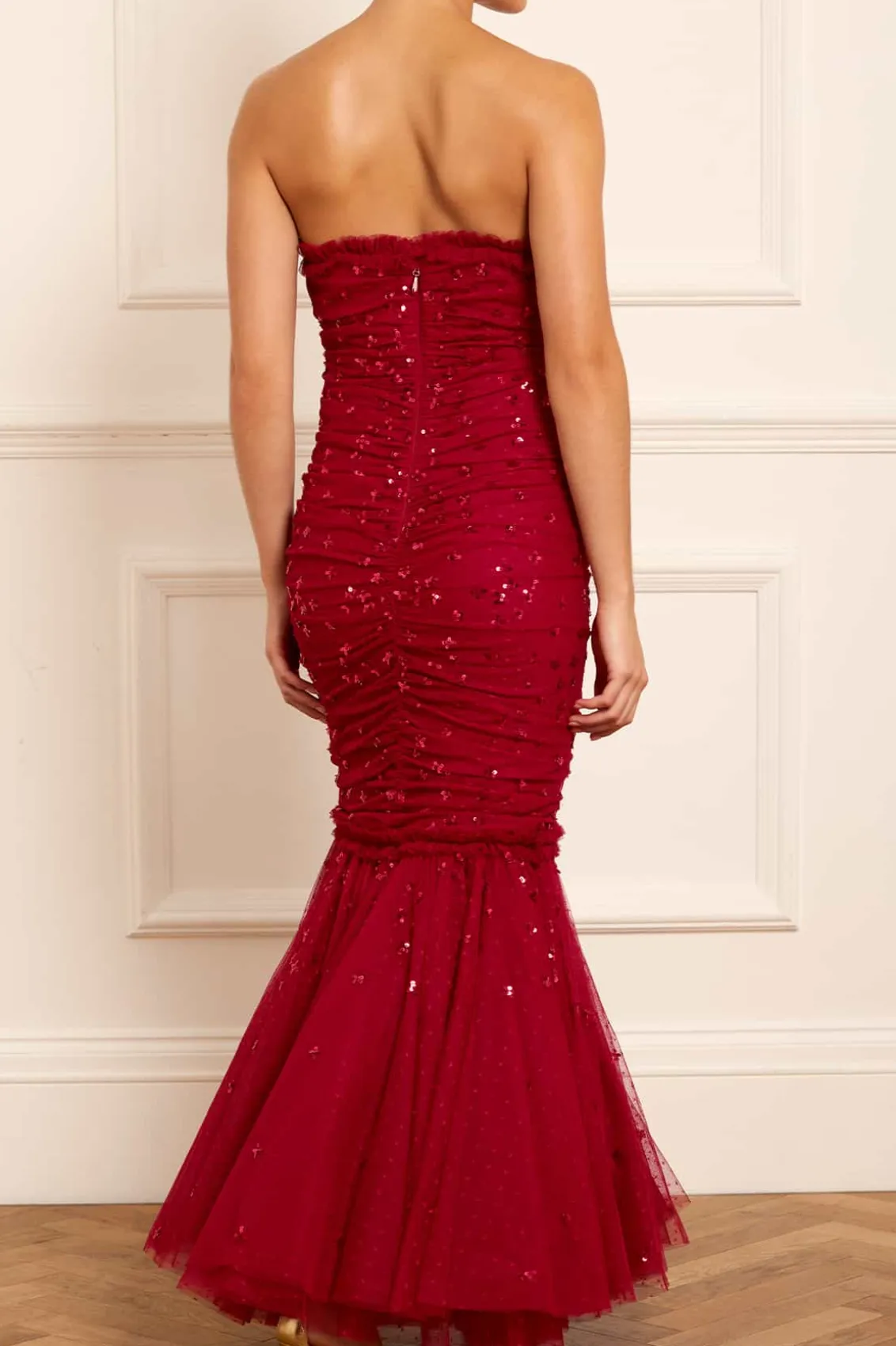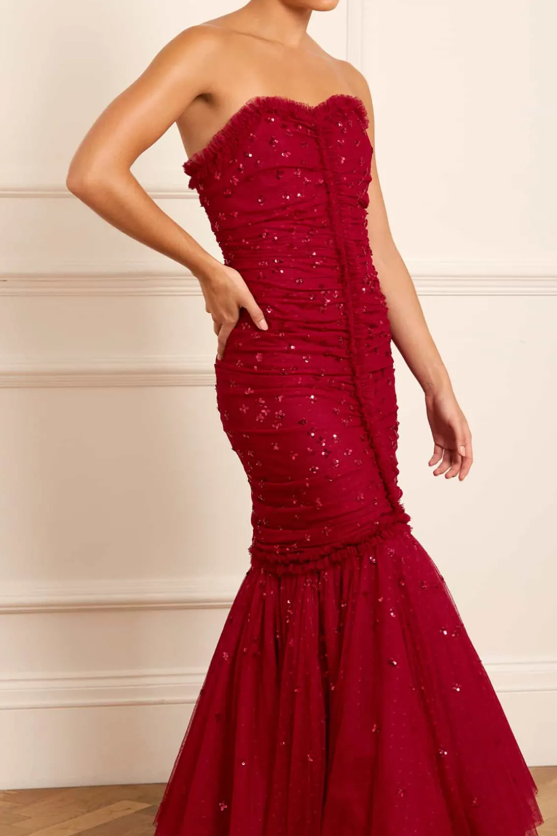 The Scatter Sequin Strapless Ankle Gown in Red. This gown is embellished with a shimmering scatter sequin motif that graduates towards the hem. This gown features a slim silhouette with soft, flattering drapes across the body. The elegant strapless sweetheart neckline and fishtail skirt are adorned with frothy tulle ruffles, adding a romantic touch. Crafted with signature Needle & Thread frills for added romantic styling. The internal corset construction in stretch power mesh ensures comfort and fit while maintaining the garment’s shape and hold. A statement piece you’ll forever treasure.