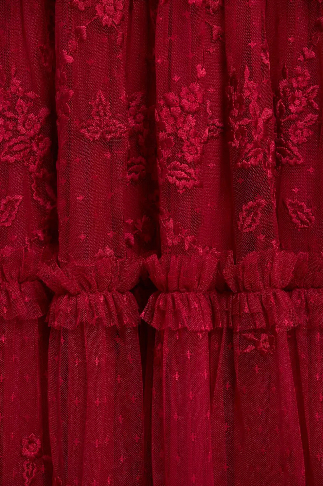 The Autumn Lace Long Sleeve Ankle Gown in Red. This signature Needle & Thread style is designed with floral motif embroidery inspired by antique lace designs. This gown is developed with romantic sheer long sleeves, and a gathered tiered hem, and is created from layers of soft tulle to create a flattering silhouette. A classic and contemporary style.