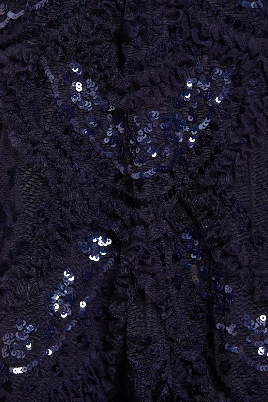 The Carmen Ruffle Ankle Gown in Navy. Designed with delicate tulle ruffles shaped into scallop sections, perfectly positioned to create a signature Needle & Thread romantic, textured look. This gown is beautifully embroidered with floral vine borders, featuring highlights of lustrous sequins for a glistening effect. A new wardrobe favourite.
