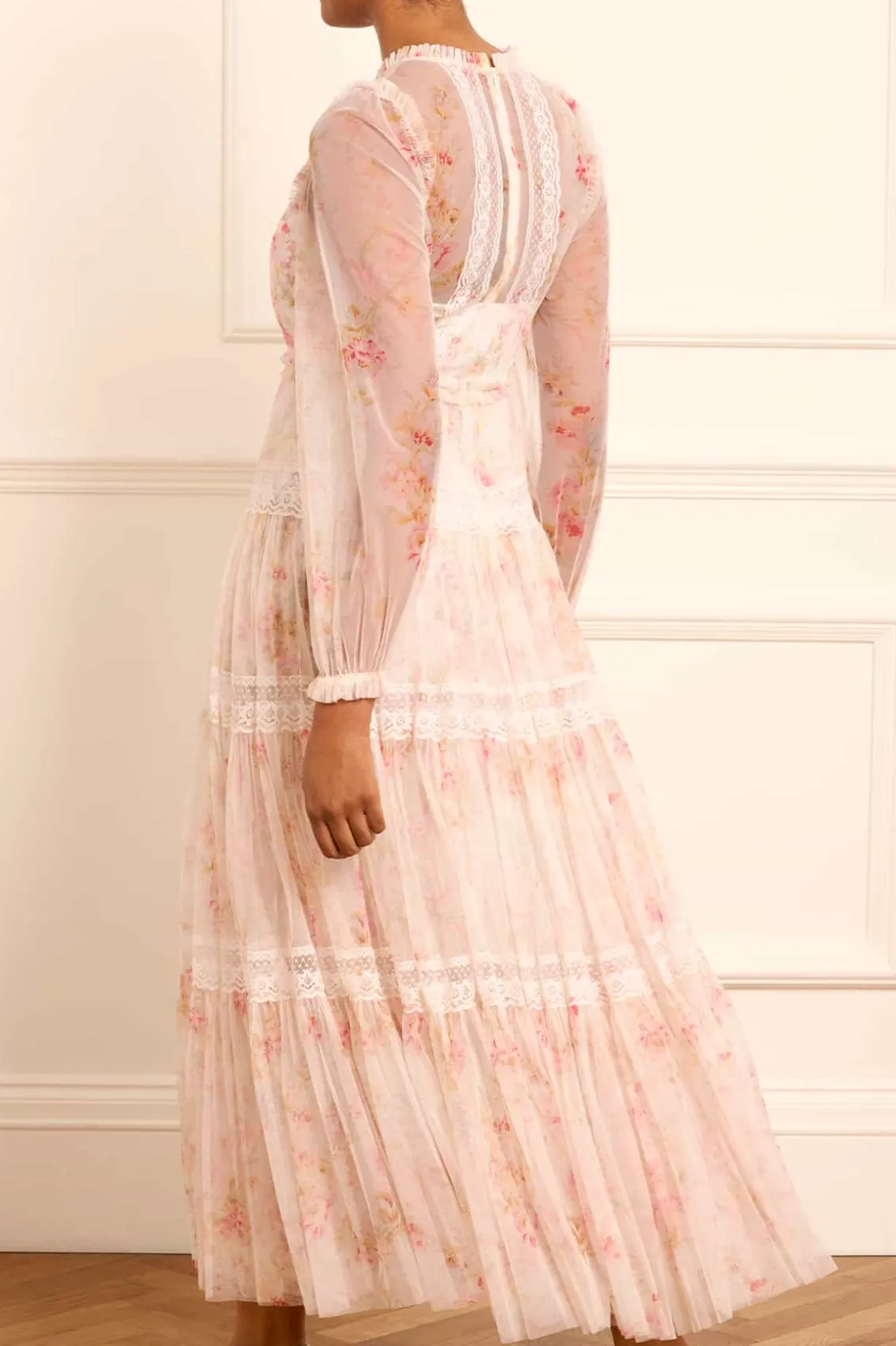 The Enchanted Garden Lace Ankle Gown in Moonshine. Beautifully designed with a signature Needle & Thread style print taken from archive hand-painted wallpaper depicting romantic garden florals and historical motifs. Inspired by Victorian styling, featuring lace trims that are perfectly positioned along gently gathered skirt tiers, adorning this printed tulle gown. Crafted with sheer printed blouson sleeves with ruffle cuffs and softly gathered tulle frills decorate the neckline, armhole, and waistband. The skirt is made up of layers of signature Needle & Thread soft tulle for romantic styling. A contemporary style you’ll forever treasure.