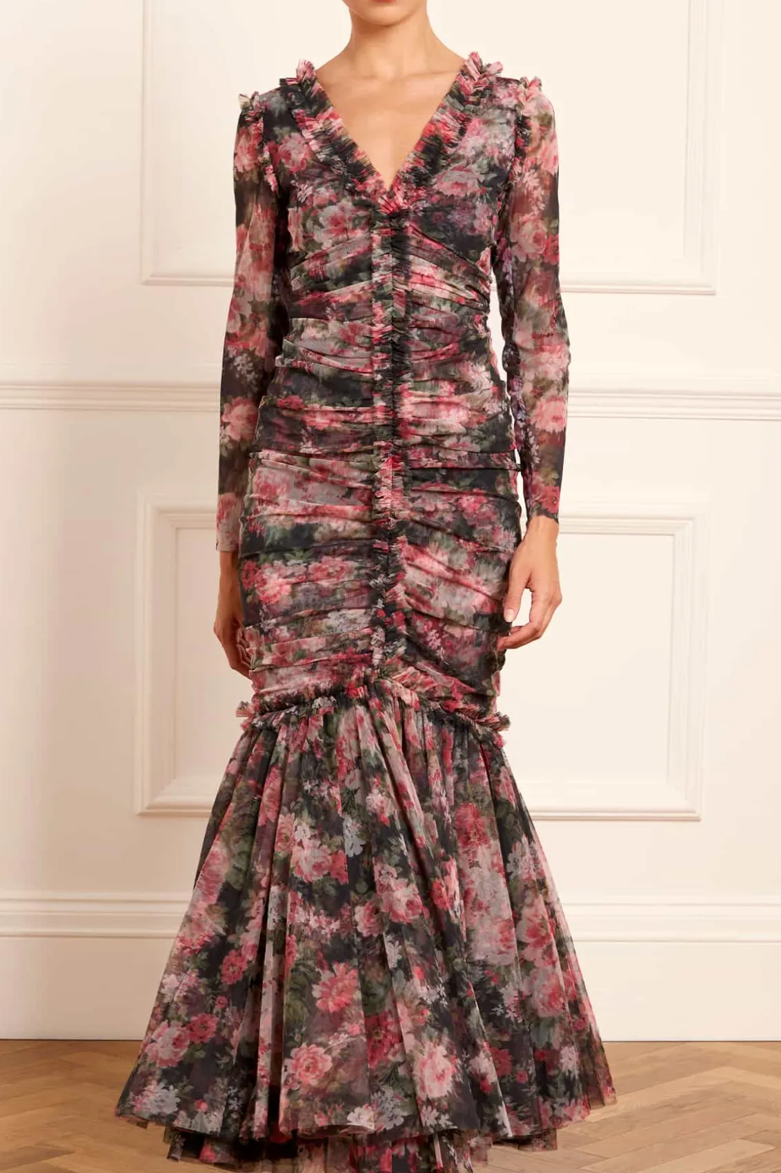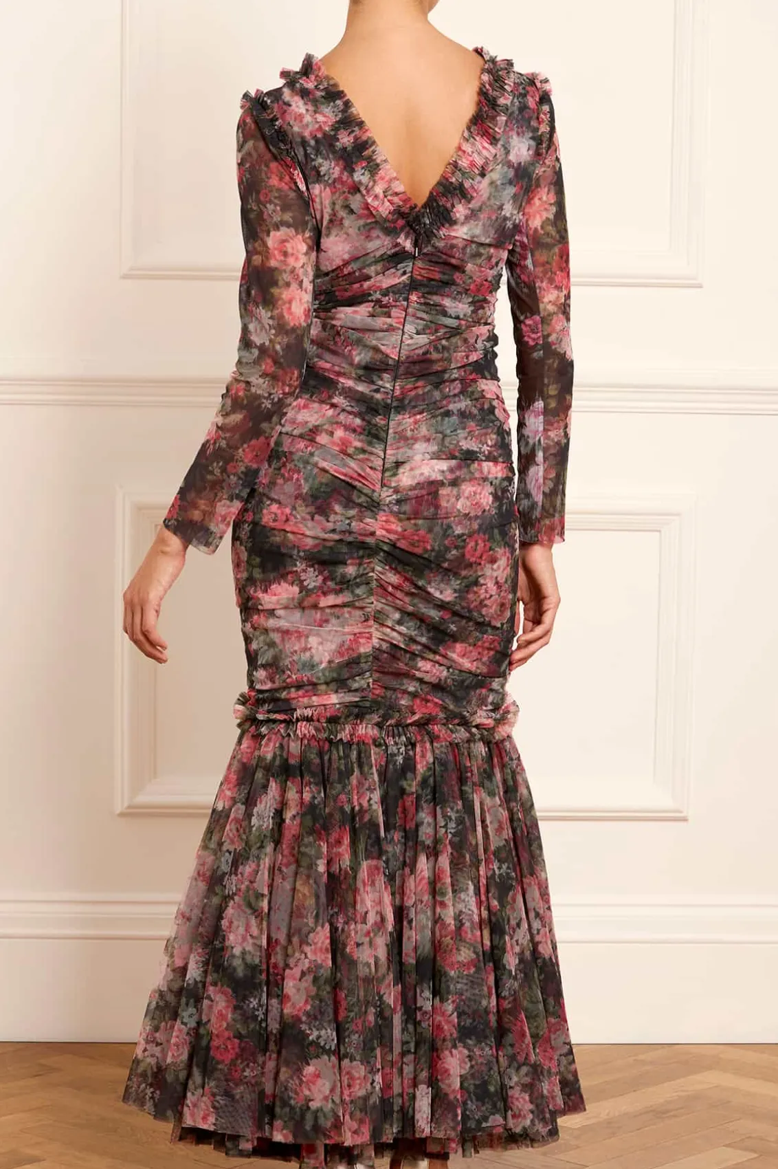 The Midnight Dance Long Sleeve Ankle Gown in Graphite. Beautifully printed with a floral design featuring luxurious blooms taken from archive, hand-painted artwork from the early 1900s. The statement fishtail skirt is crafted from layers of signature Needle & Thread soft tulle and net for added drama. The elegant V-neckline is adorned with frothy tulle ruffles, featuring long slim sleeves. Crafted with signature Needle & Thread frills on the shoulder, skirt seam, and bodice for a touch of romantic styling. This gown creates the most stunning movement as you walk.