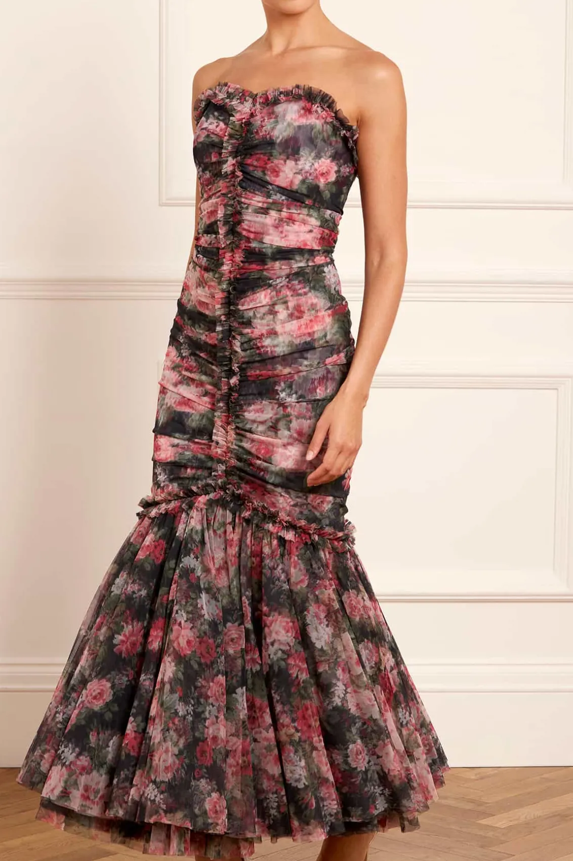 The Midnight Dance Strapless Ankle Gown in Graphite. Beautifully printed with a floral design featuring luxurious blooms taken from archive, hand-painted artwork from the early 1900s. This gown features a slim silhouette with soft, flattering drapes across the body. The statement fishtail skirt is crafted from layers of signature Needle & Thread soft tulle and net for added drama. The elegant V-neckline is adorned with frothy tulle ruffles, featuring long slim sleeves. Crafted with signature Needle & Thread frills on the shoulder, skirt seam, and bodice for a touch of romantic styling. This gown creates the most stunning movement as you walk.