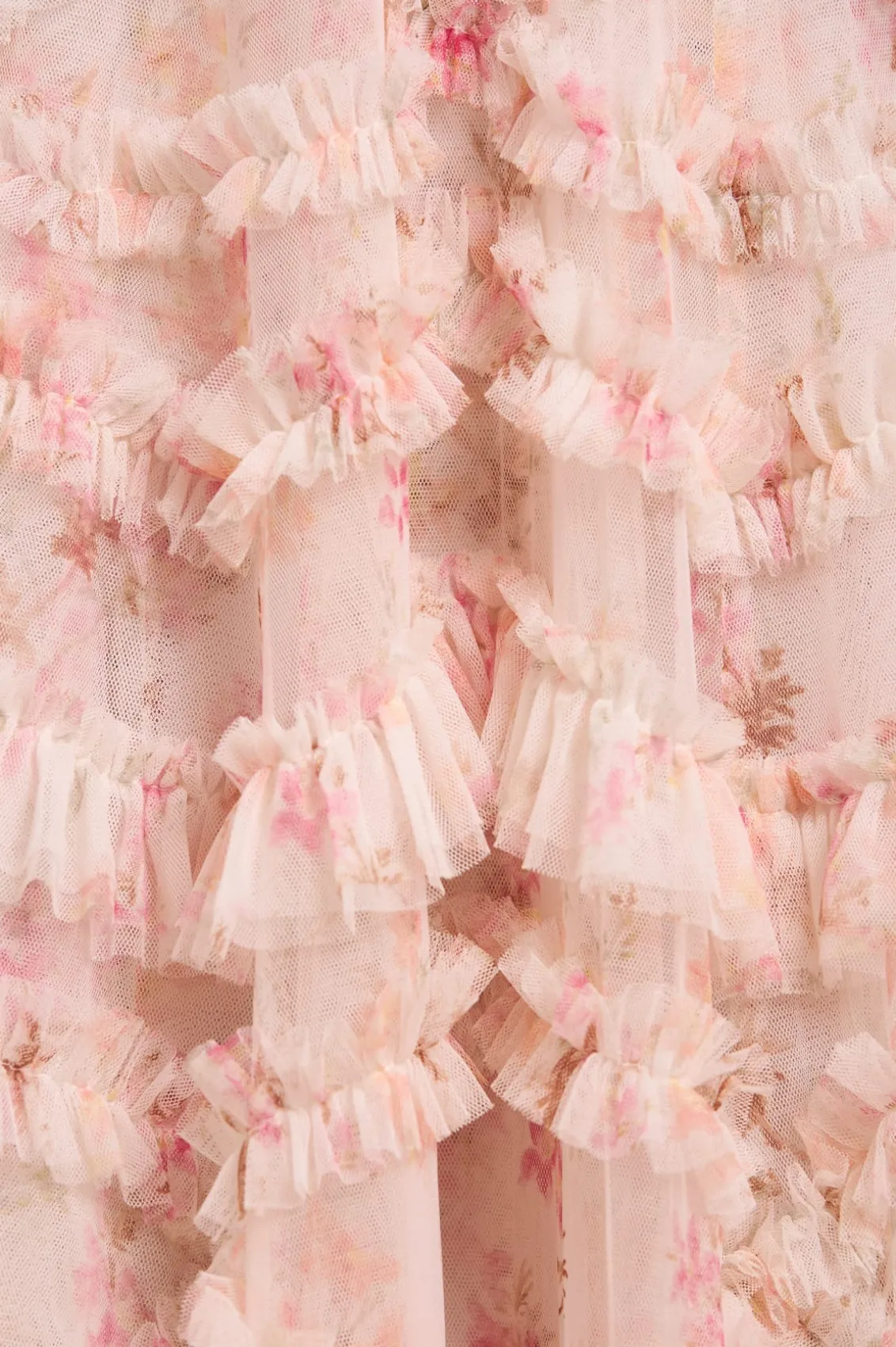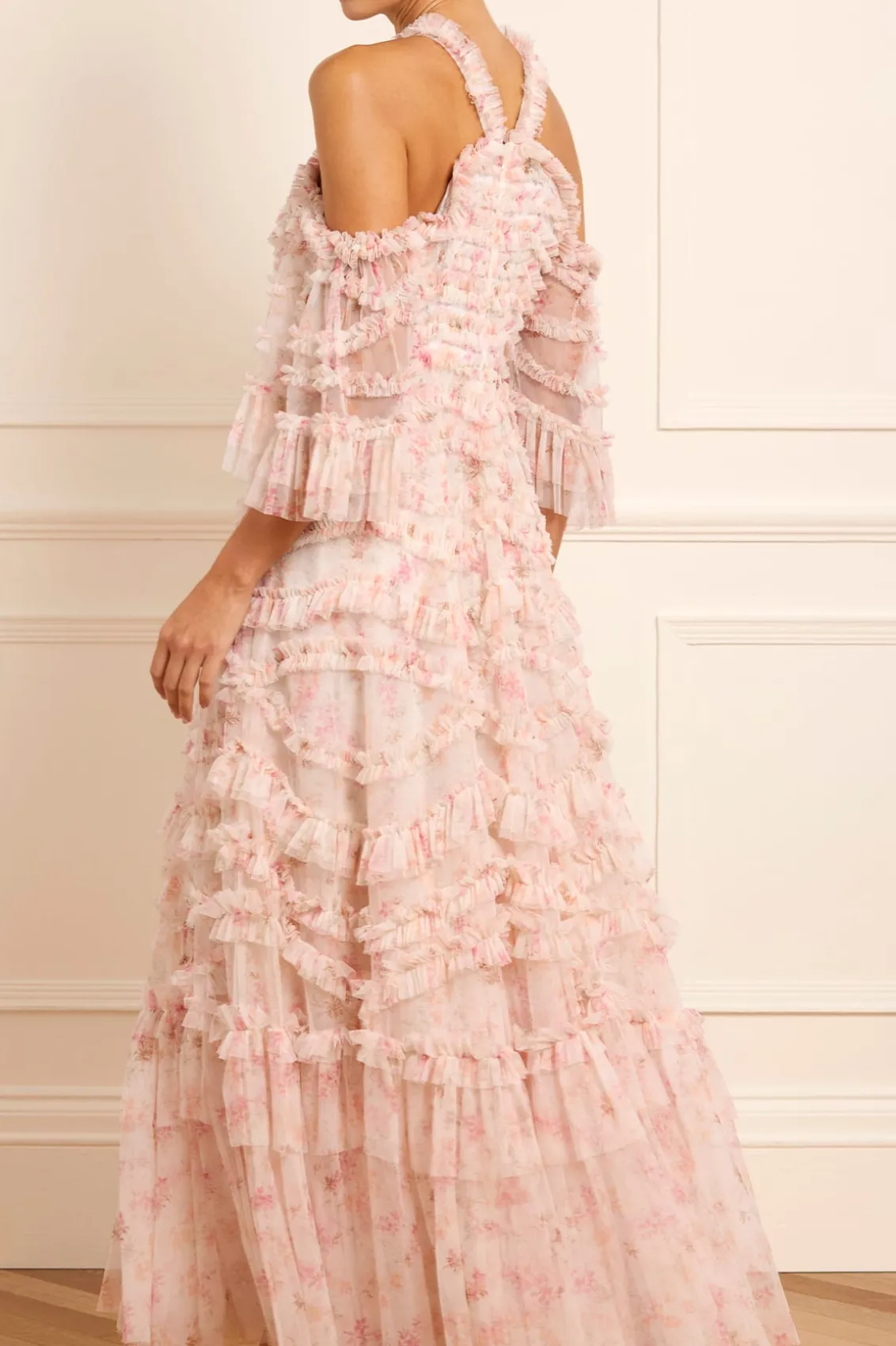 NEW SEASON. The Ophelia Ditsy Bronte Off Shoulder Gown in Moonshine/Pink. This gown features a beautiful, romantic trailing print taken from an archive, hand-painted artwork from the early 1900s, depicting soft, whimsical ditsy floating florals. Designed with short, fluted sleeves and delicate tulle ruffles that mirror the gown’s intricate detailing. The statement off-the-shoulder gown has a flattering curved neckline and straps, both adorned with signature Needle & Thread soft tulle ruffles. The silhouette is exceptionally flattering, with a fitted bodice that flows into a generous skirt made up of layers of net and tulle, culminating in a sweeping hemline that ensures a breathtaking entrance.