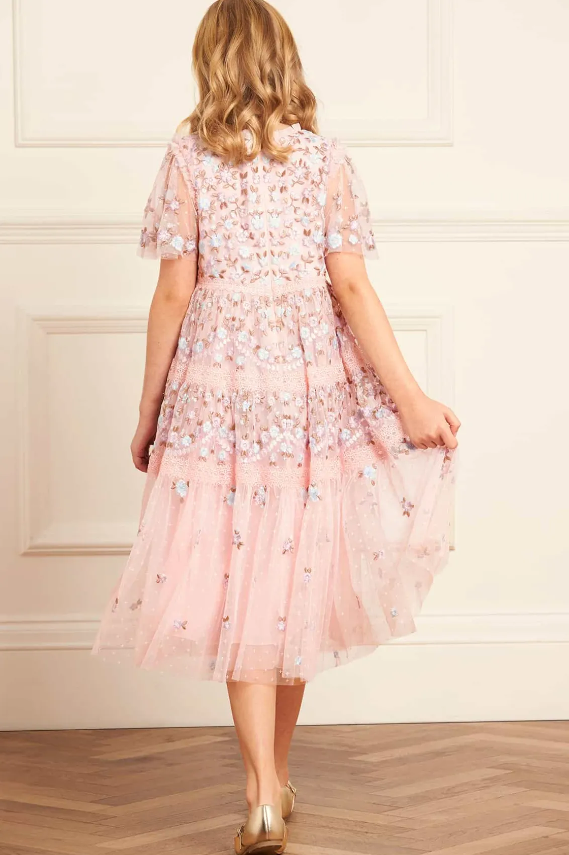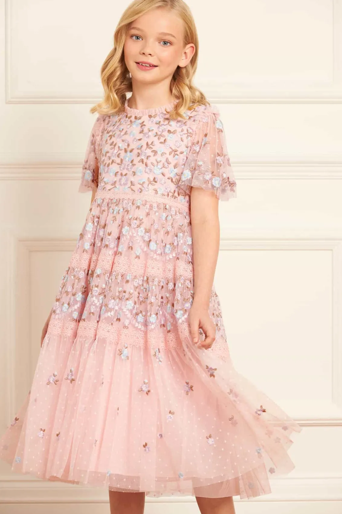 NEW SEASON. The Garland Ribbon Kids Dress in Dusk Pink. This enchanting dress features intricate embroidery inspired by Victorian lace, with delicate pastel florals and fresh white accents. The tiered skirt, adorned with signature Needle & Thread detailing, adds a touch of magic. A perfect fairytale piece for your little one’s special occasions.