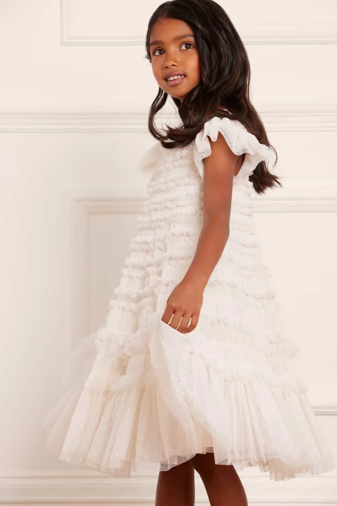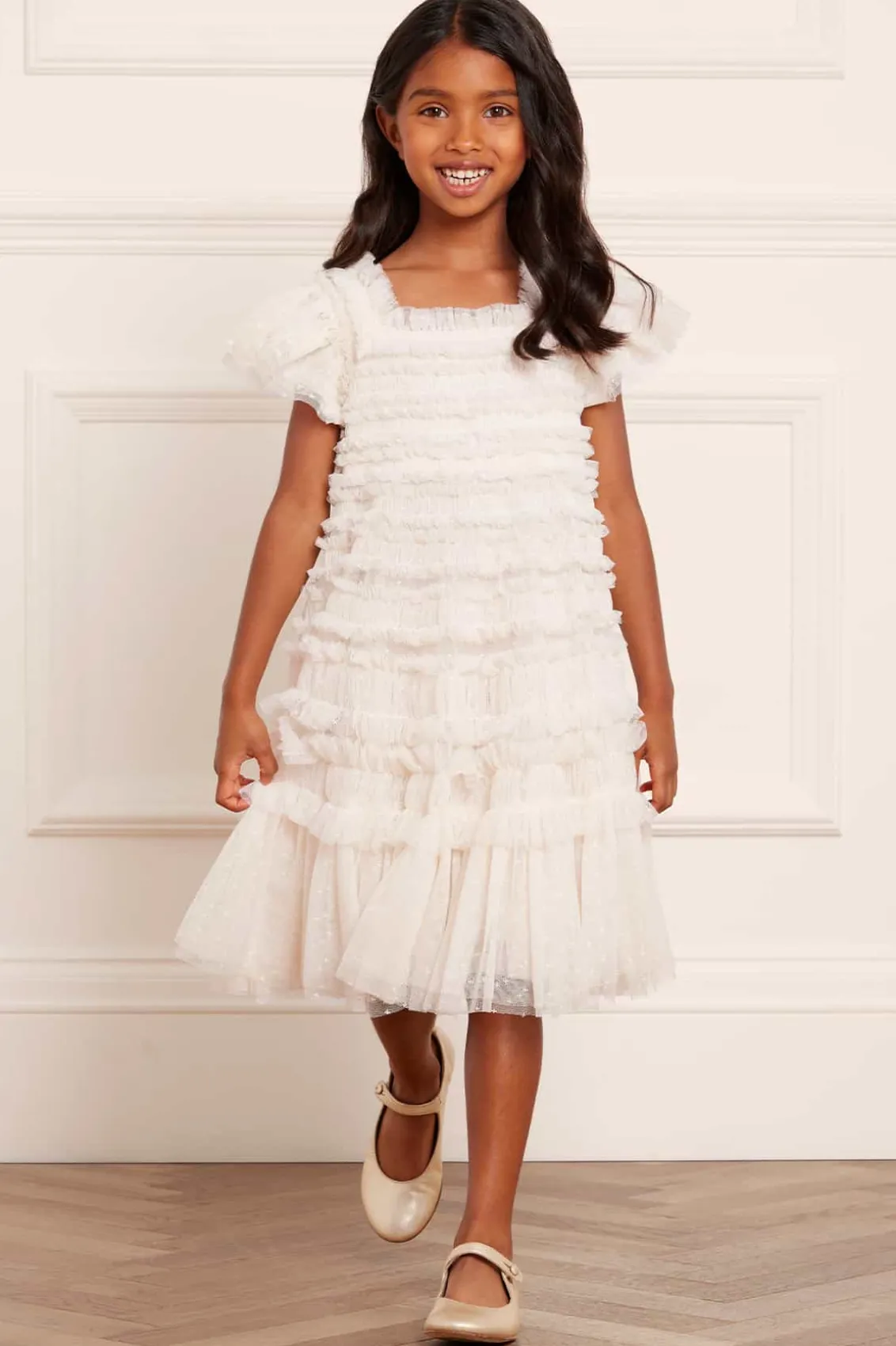 The Lisette KIDS Dress in Cream. This dress is beautifully designed with a signature Needle & Thread textile. Crafted with a playful, frothy texture created using soft tulle panels gathered to create an all over pretty effect. Designed with short sleeves and underlayers of tulle to create a generous volume skirt. The perfect dress for your little one’s upcoming occasions.