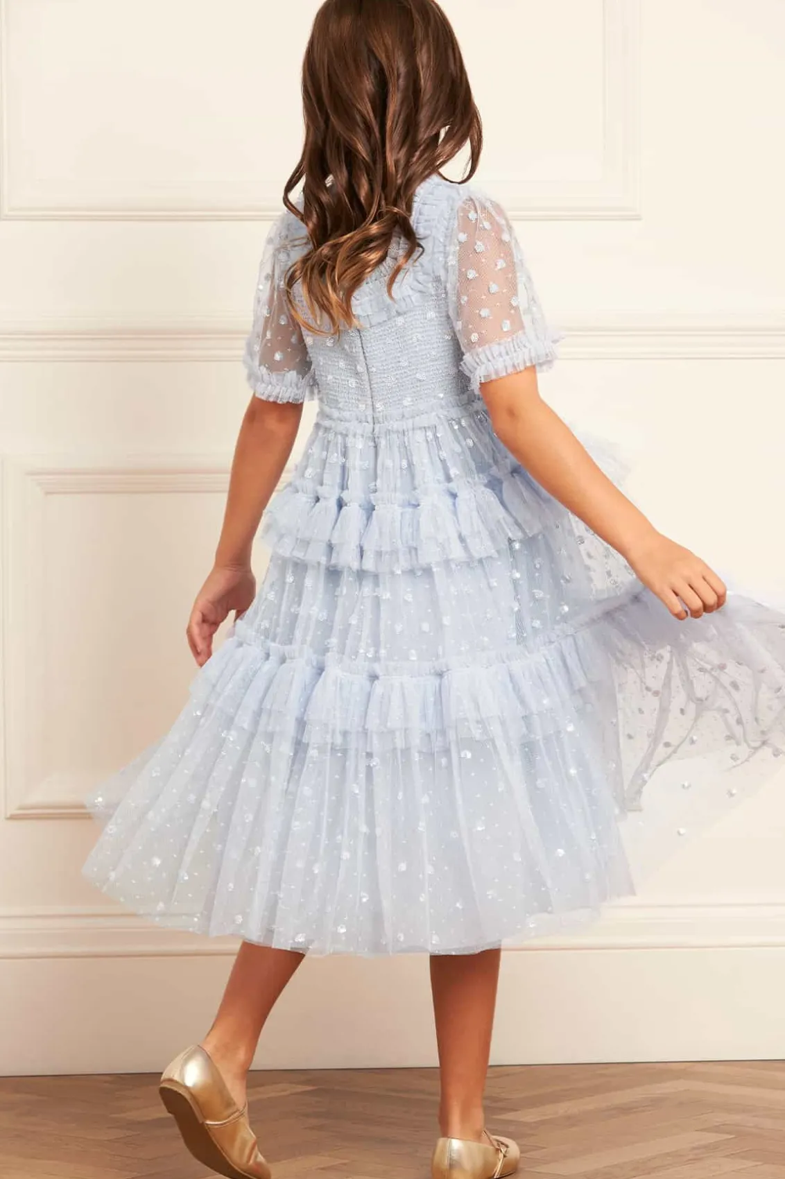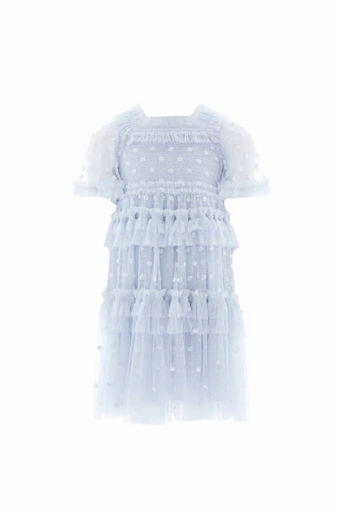 NEW SEASON. The Polka Dot Smocked Kids Dress in Dusk Blue. This vintage-inspired dress features a smocked bodice with intricate tonal embroidery and a frothy, playful skirt made of layered tulle and tiered ruffles. Shimmering sequin polka dots add a sparkling touch, making this dress perfect for your little one to shine in the spotlight.