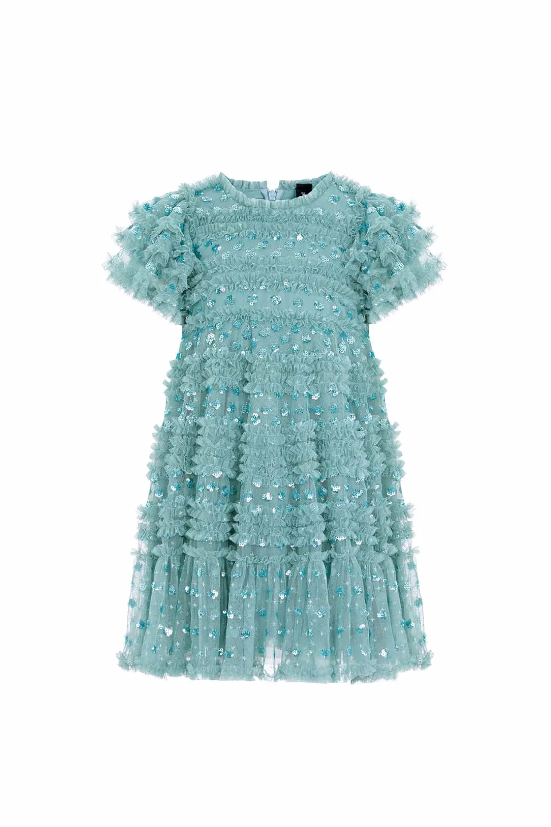 NEW SEASON. The Vivian Kids Dress in Aquamarine. This charming dress features sparkling sequin polka dots scattered across a playful silhouette. Designed with tulle frills and ruffled sleeves, crafted with signature Needle & Thread detailing, add a whimsical touch. The perfect dress to make your little one shine at their next special event.