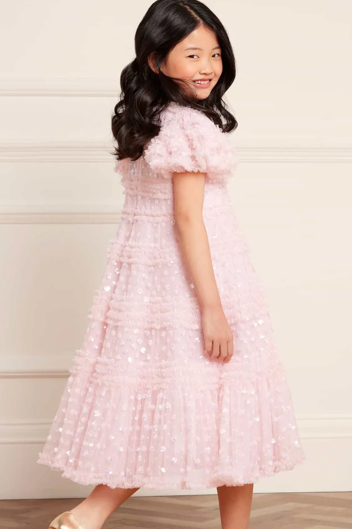 NEW SEASON. The Vivian KIDS Dress in Dusk Pink. This pretty dress is adorned with sparkling sequin polka dot motifs, scattered throughout. Beautifully designed with a playful silhouette, tulle frills and ruffled sleeves for signature Needle & Thread detailing. Let your little one shine at their next event.