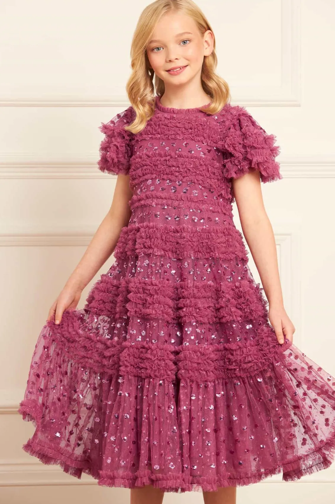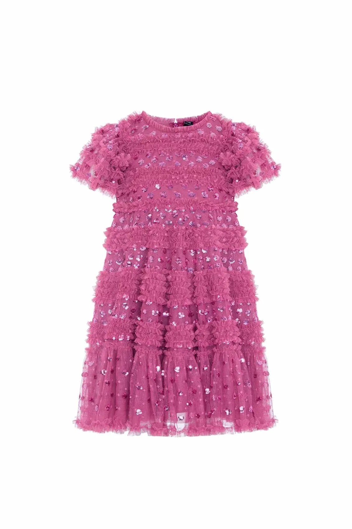NEW SEASON. The Vivian Kids Dress in Pink Topaz. This charming dress features sparkling sequin polka dots scattered across a playful silhouette. Designed with tulle frills and ruffled sleeves, crafted with signature Needle & Thread detailing, add a whimsical touch. The perfect dress to make your little one shine at their next special event.