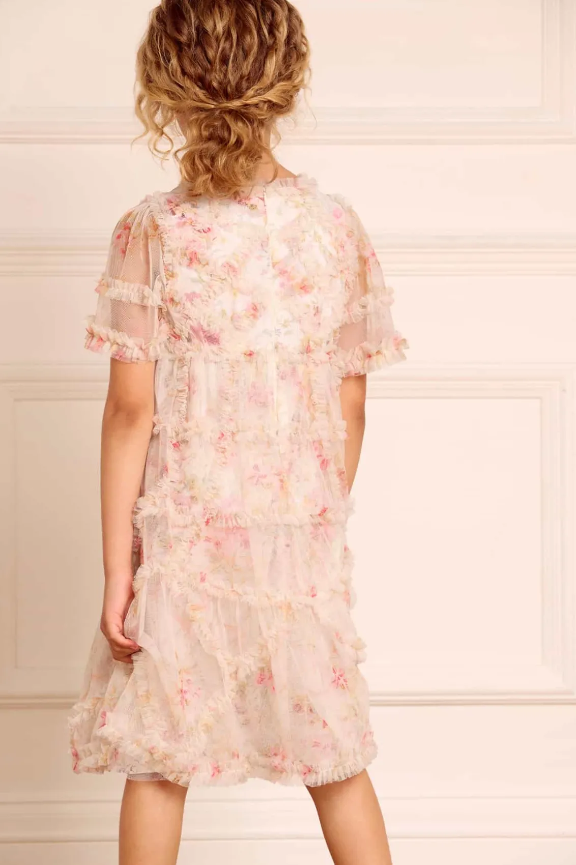 The Enchanted Garden Maeve Kids Dress in Moonshine. This signature Needle & Thread style print is taken from archive hand-painted wallpaper design depicting romantic garden florals and historical motifs. Created in our soft signature tulle fabric with perfectly placed gathered frills to create a pretty, frothy textile. A piece your little one will forever treasure.