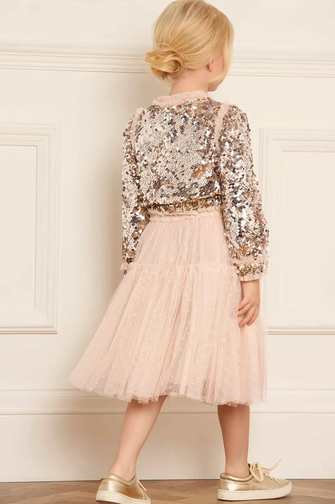 The Hallie KIDS Bomber Jacket in Silver. Reintroducing a signature archive product: The Needle & Thread bomber jacket. This playful cropped bomber is designed to be styled with our Tulle KIDS Skirt for the prettiest statement co-ord. Developed with signature frills on the cuffs, shoulders, and around the zip, creating a frothy texture. This charming piece is embellished with a specially developed all-over sequin fabric, made by intricately applying delicate side-hole sequins that overlap to form a decadent, luxe, shimmering effect. This bomber will be the star of their wardrobe.