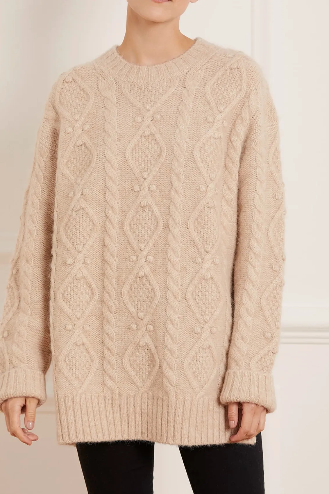 NEEDLE & THREAD EXCLUSIVE. The Sylvie Cable Longline Jumper in Birch. This premium knitwear piece is designed in a super-soft, fluffy alpaca-blend yarn. This cosy jumper is crafted with a mix of diamond-shaped cables and twists in an intricate textile. Adorned with playful flower bobbles adding a feminine texture. Designed with a relaxed fit, subtle split details and loose sleeves to create a cosy feel. The ultimate wardrobe staple this season.