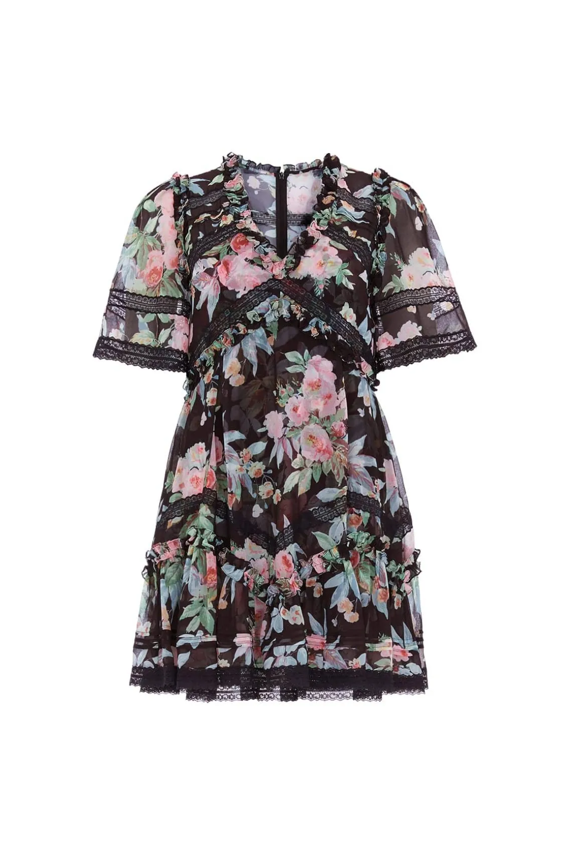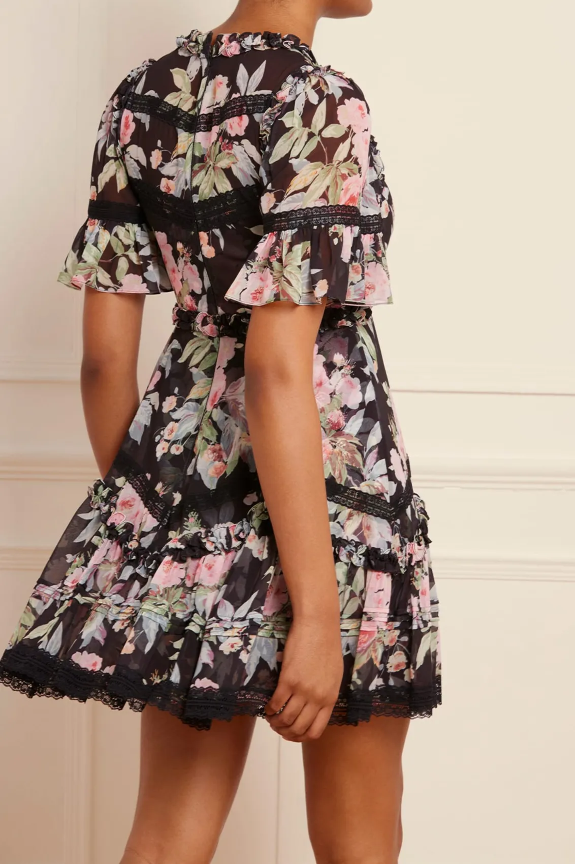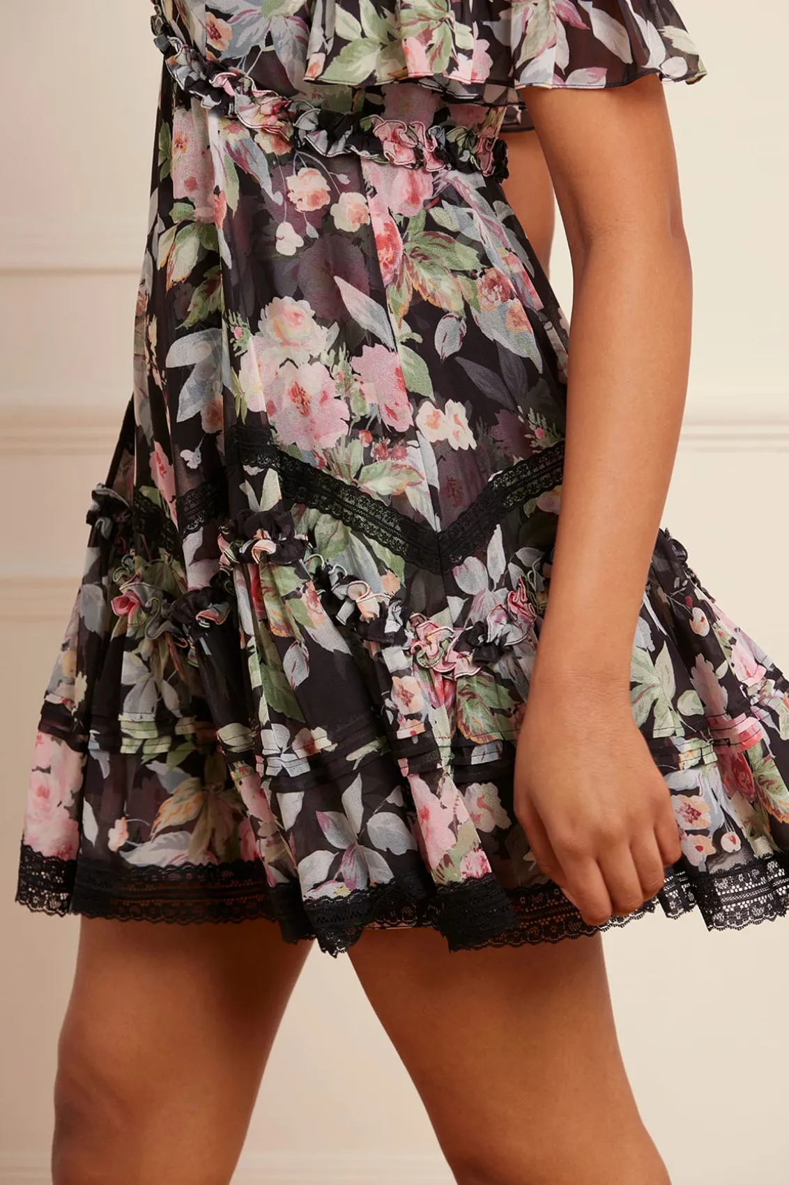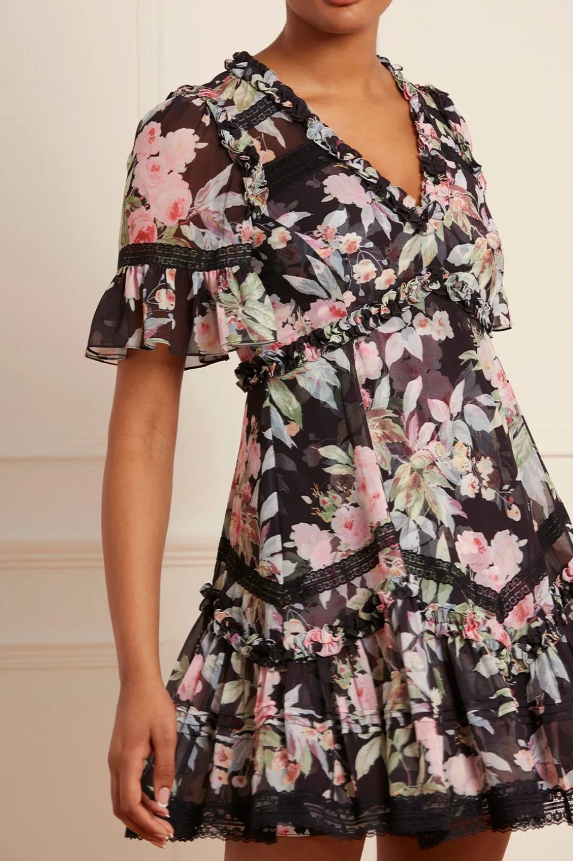 The Paradise Garden Sonata Georgette Micro Mini Dress in Graphite. The print of this dress is inspired by an enchanting paradise garden print, taken from an 1900s hand-painted artwork. This dress is designed with a luxe, twilight inspired colour palette in rich, lush floral motifs to create a truly alluring print. Developed in our soft georgette fabric creating a flowing silhouette. Designed with Victorian inspired garments featuring a lace insert detailing and panelling. A transitional day to night piece.