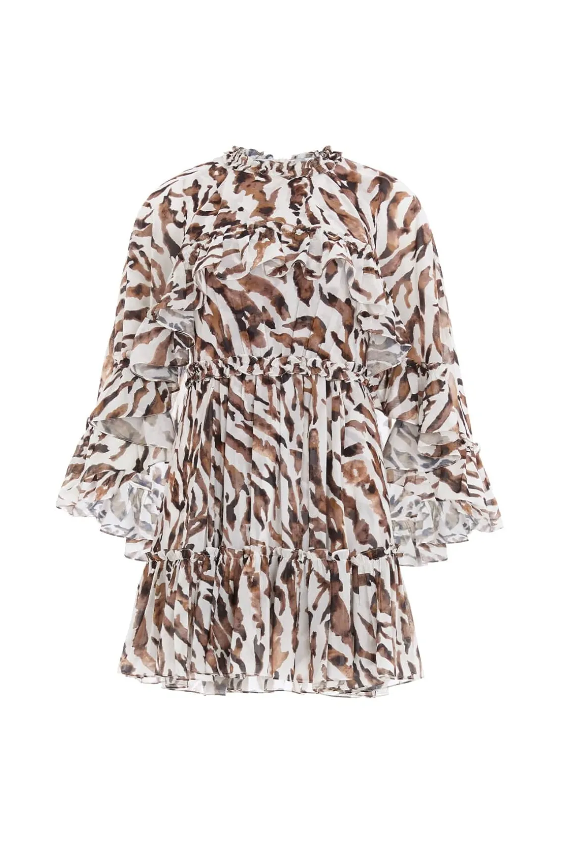NEW SEASON. The Zebra Harper Chiffon Cape Micro Mini Dress in Moonshine. This zebra print dress showcases hand-painted, water-inspired artwork on soft chiffon for a romantic, flowing silhouette. Featuring a dramatic detachable cape for versatile styling, this chic mini dress transitions effortlessly from day to night.