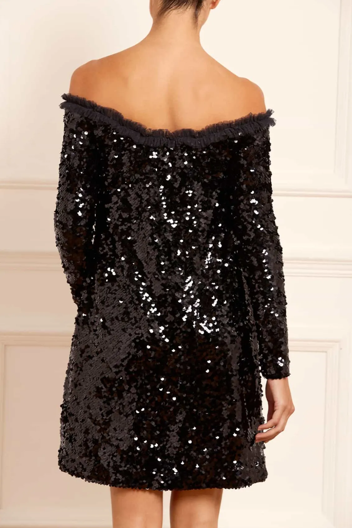 NEEDLE & THREAD EXCLUSIVE. The Evie Off-Shoulder Micro Mini Dress in Graphite. This statement dress is decorated with sparkling sequins. Designed with an elegant off-shoulder design adorned with signature Needle & Thread tulle frills and slim long sleeves. Crafted with a flattering loose-fit A-line silhouette. Developed with an all-over sequin fabric featuring side-hole sequins that overlap to create a decadent, luxe, shimmering look with a stretch base for comfort and style. The dress also includes a mesh bralette for ultimate comfort and an easy fit. The perfect party dress you’ll wear time and time again.