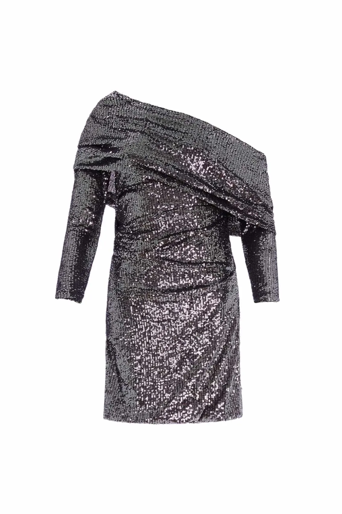 The Nova One-Shoulder Micro Mini Dress in Gunmetal. This dress is inspired by vintage Hollywood glamour. Beautifully designed with an elegant off-the-shoulder structure. Adorned all over with tiny glittering sequins for the ultimate statement. Crafted with a slim silhouette enhanced by soft drapes across the body. The perfect romantic dress for an upcoming special occasion. We hope you adore this new style as much as we do at Needle & Thread head office.