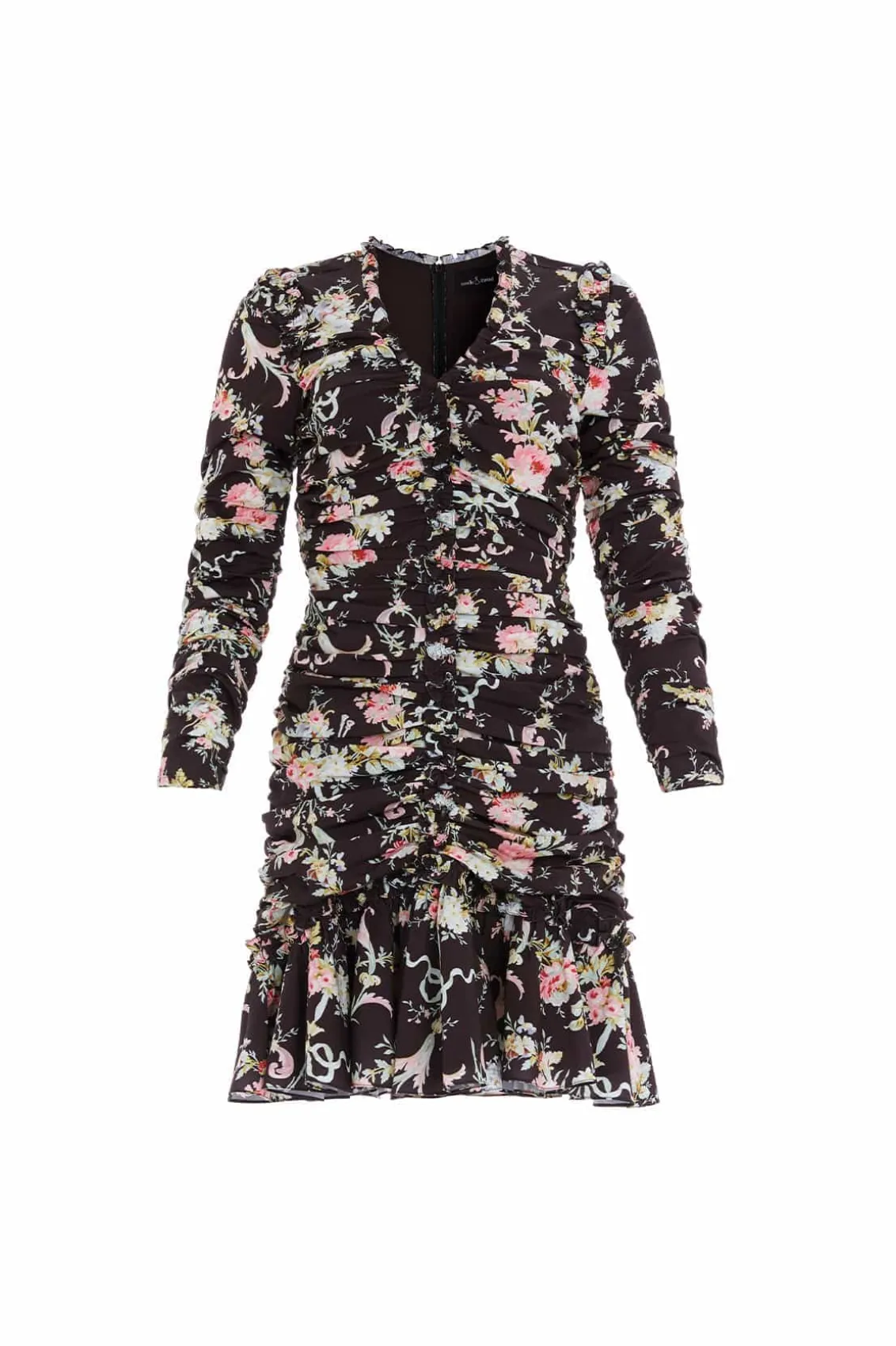 The Enchanted Garden Ellen Crepe Micro Mini Dress in Graphite. A signature Needle & Thread print inspired by an archival hand-painted wallpaper design. This exquisite artwork brings to life a vision of romantic garden florals and historical motifs, beautifully translating the past into contemporary fashion. Crafted from crepe fabric with a touch of stretch, this gown offers a flattering fit that gracefully contours the body. The softly gathered bodice and slim sleeves add a romantic touch, creating a silhouette that is both feminine and sophisticated. The V-neckline, adorned with delicate signature frills, enhances the gown’s charm, making it a perfect choice for any occasion.