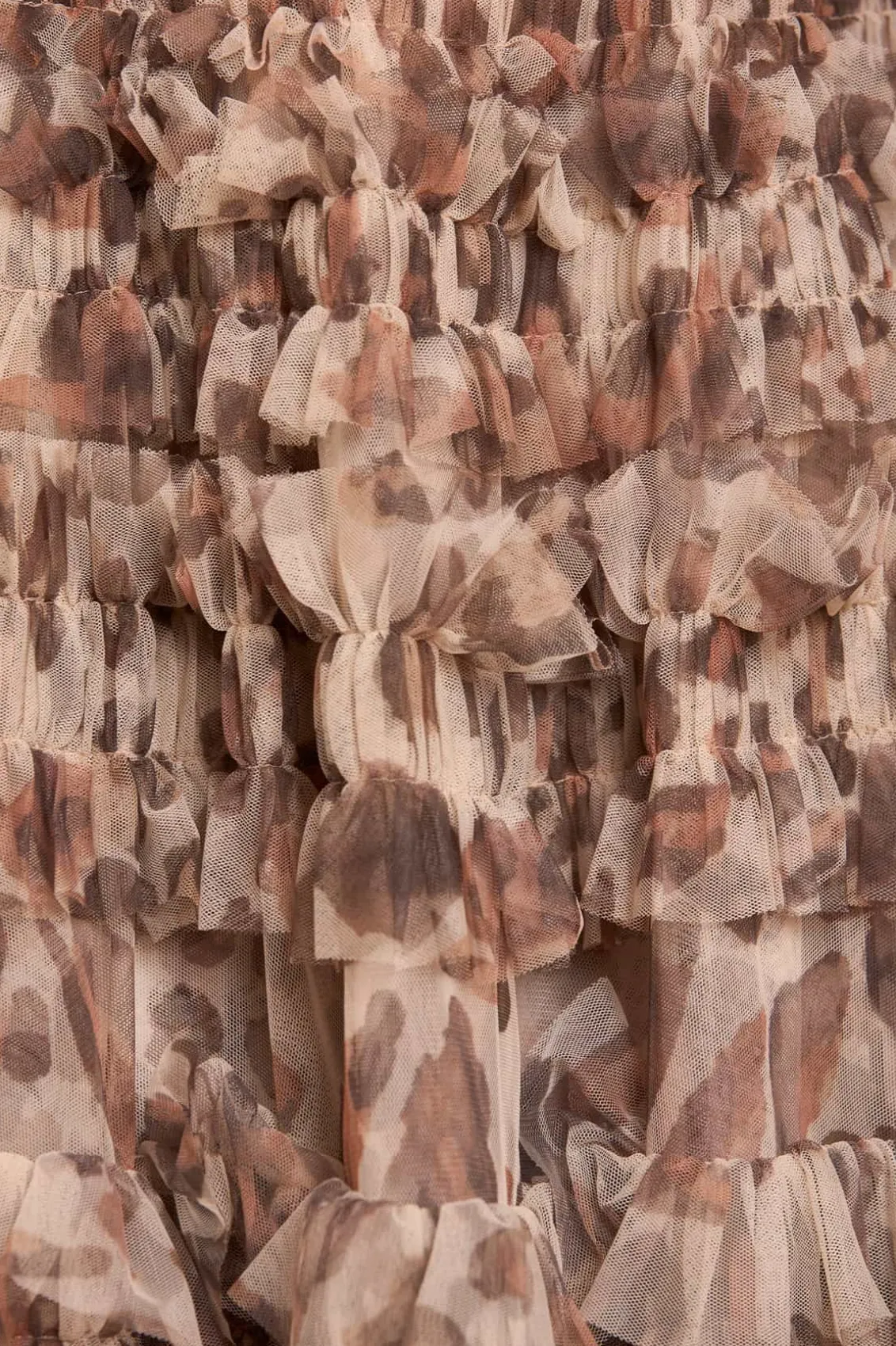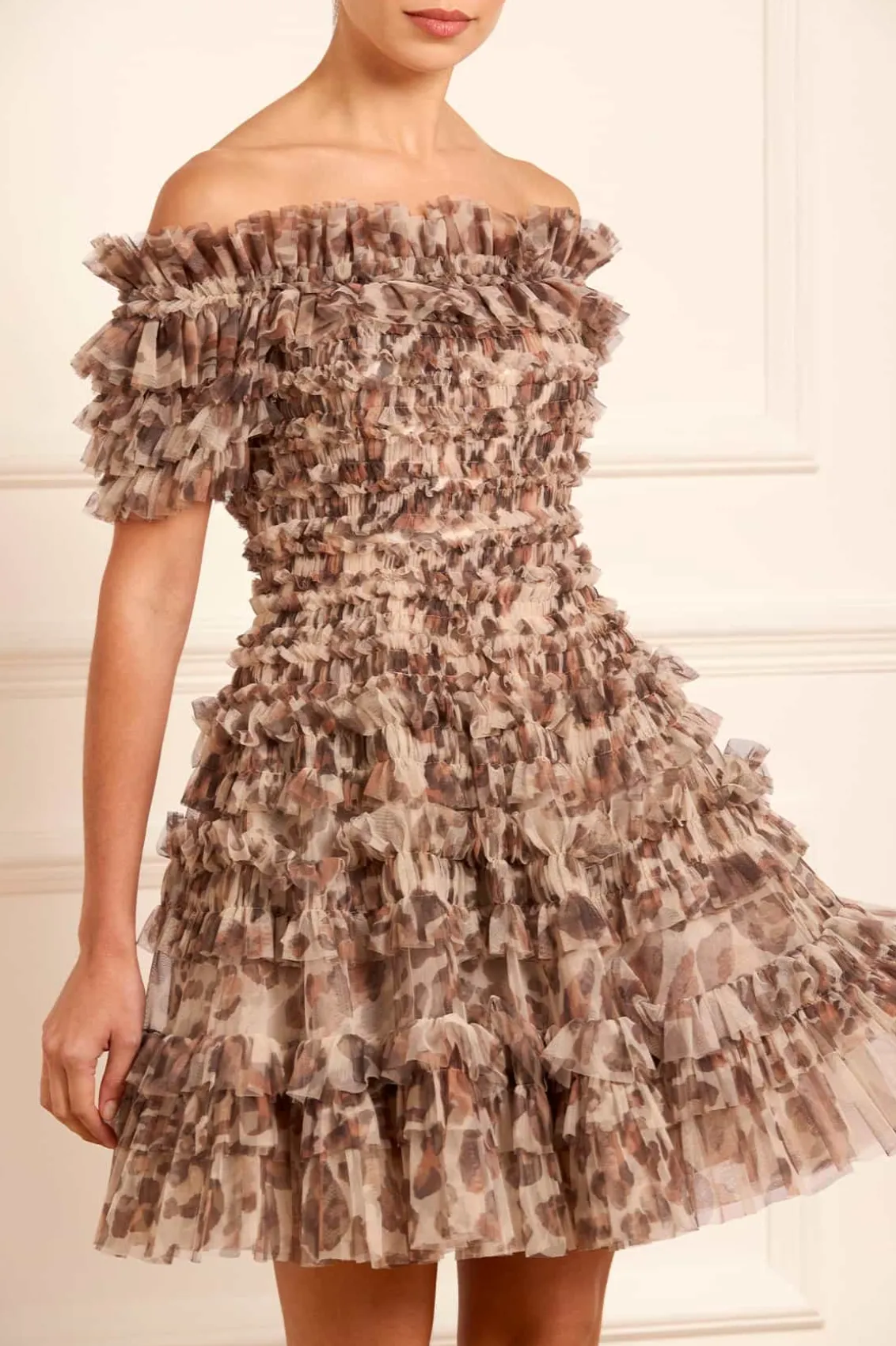 The Leopard Lisette Off-Shoulder Micro Mini Dress in Moonshine. This dress features a statement print that was hand-painted in-house using watercolour, with soft leopard motifs varying in scale and showcasing watery definition. This statement dress has an elegant off-the-shoulder design inspired by Hollywood styling. Crafted with textile tulle and double-stitched frills for a dramatic, romantic effect. Features an integrated corset for a perfect fit and to hold the silhouette. Expect all eyes on you in this romantic dress.